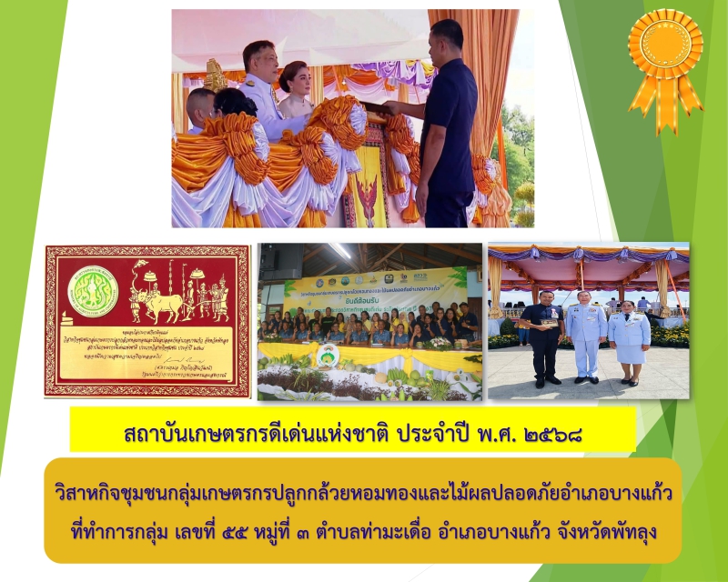 ** สถาบันเกษตรกรดีเด่นแห่งชาติ ประจำปี พ.ศ. 2568 วิสาหกิจชุมชนกลุ่มเกษตรกรปลูกกล้วยหอมทองและไม้ผลปลอดภัยอำเภอบางแก้ว ที่ทำการกลุ่ม : เลขที่ 55 หมู่ที่ 3 ดำบลท่ามะเดื่อ อำเภอบางแก้ว จังหวัดพัทลุง