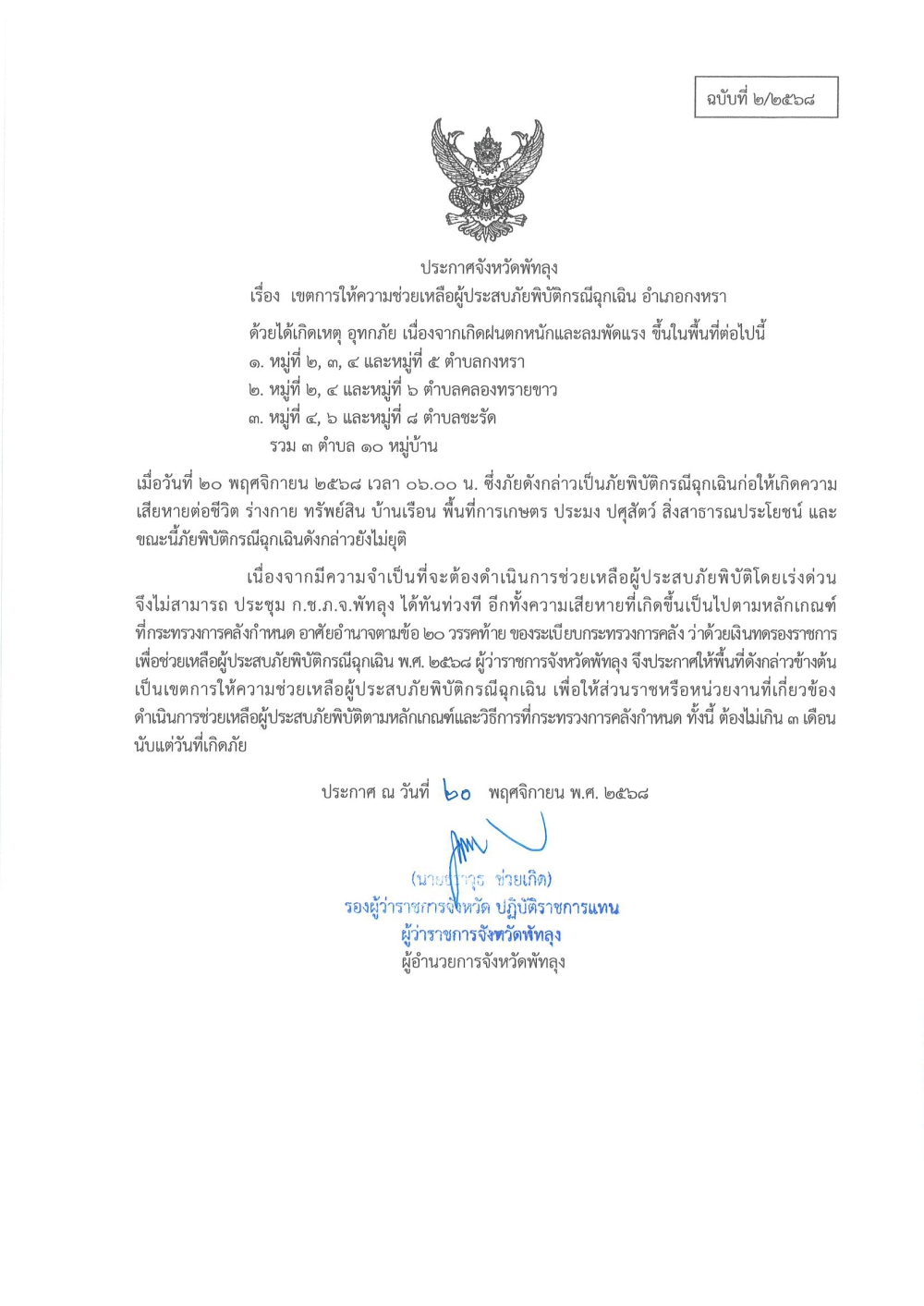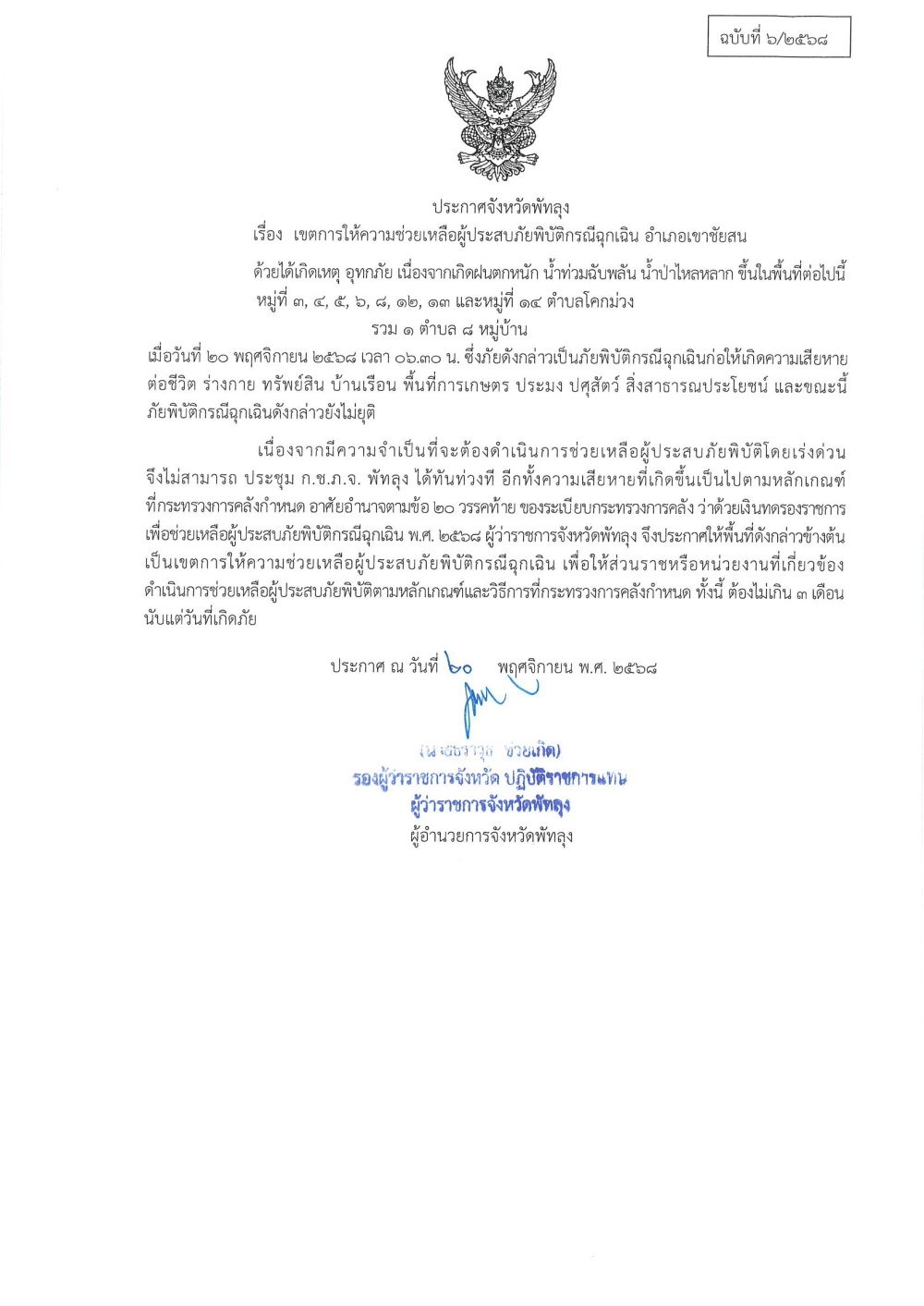 ประกาศเขตพื้นที่ประสบสาธารณภัย/เขตการให้ความช่วยเหลือผู้ประสบภับพิบัติกรณีฉุกเฉิน (อุทกภัย) ในพื้นที่จังหวัดพัทลุง ประกาศ ณ วันที่ 21 พฤศจิกายน 2568
