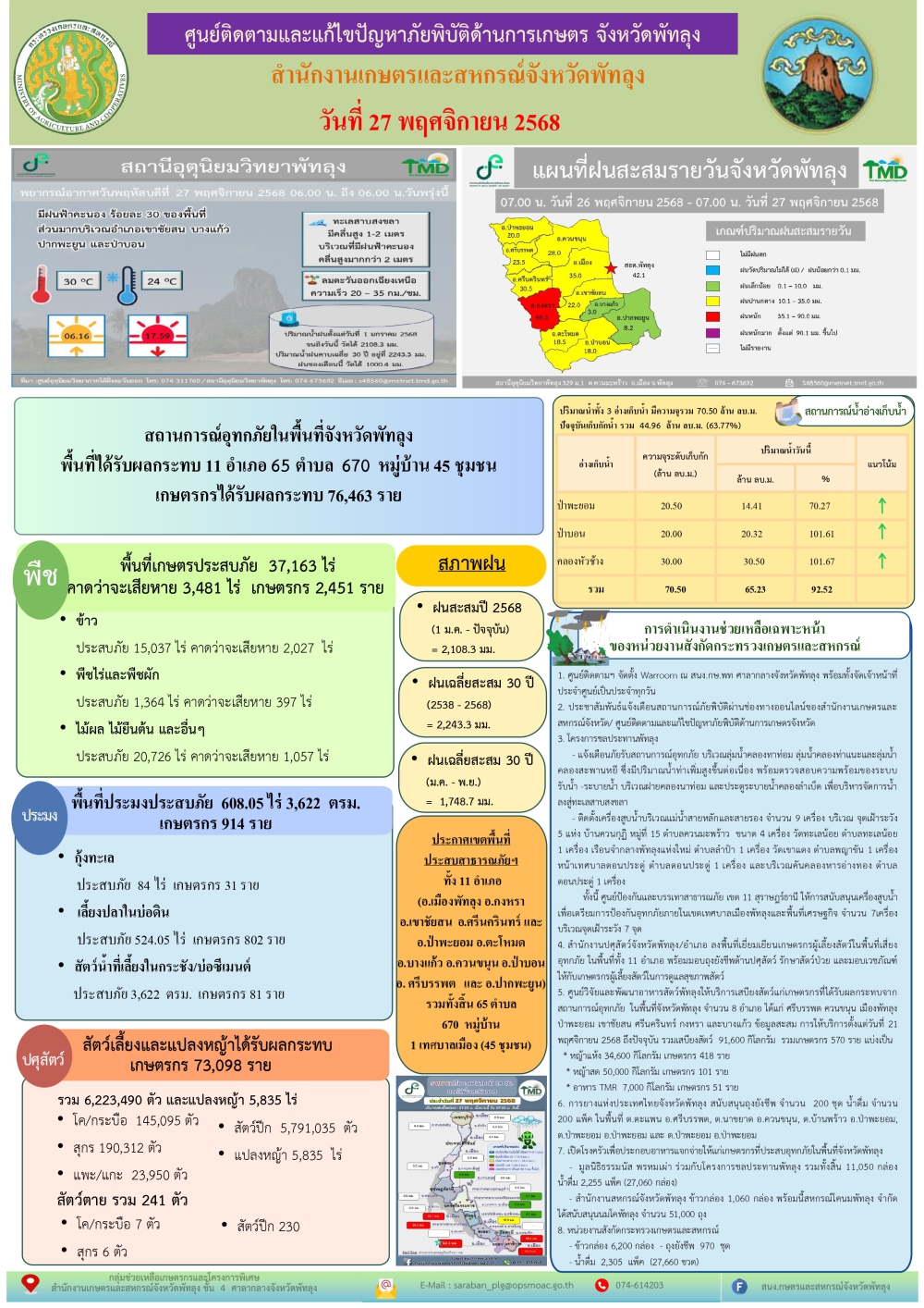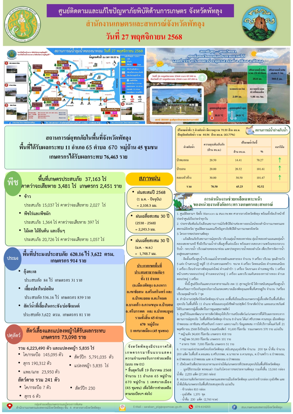 รายงานสถานการณ์ ศูนย์ติดตามและแก้ไขปัญหาภัยพิบัติด้านการเกษตร จังหวัดพัทลุง ณ วันที่ 27 พฤศจิกายน 2568