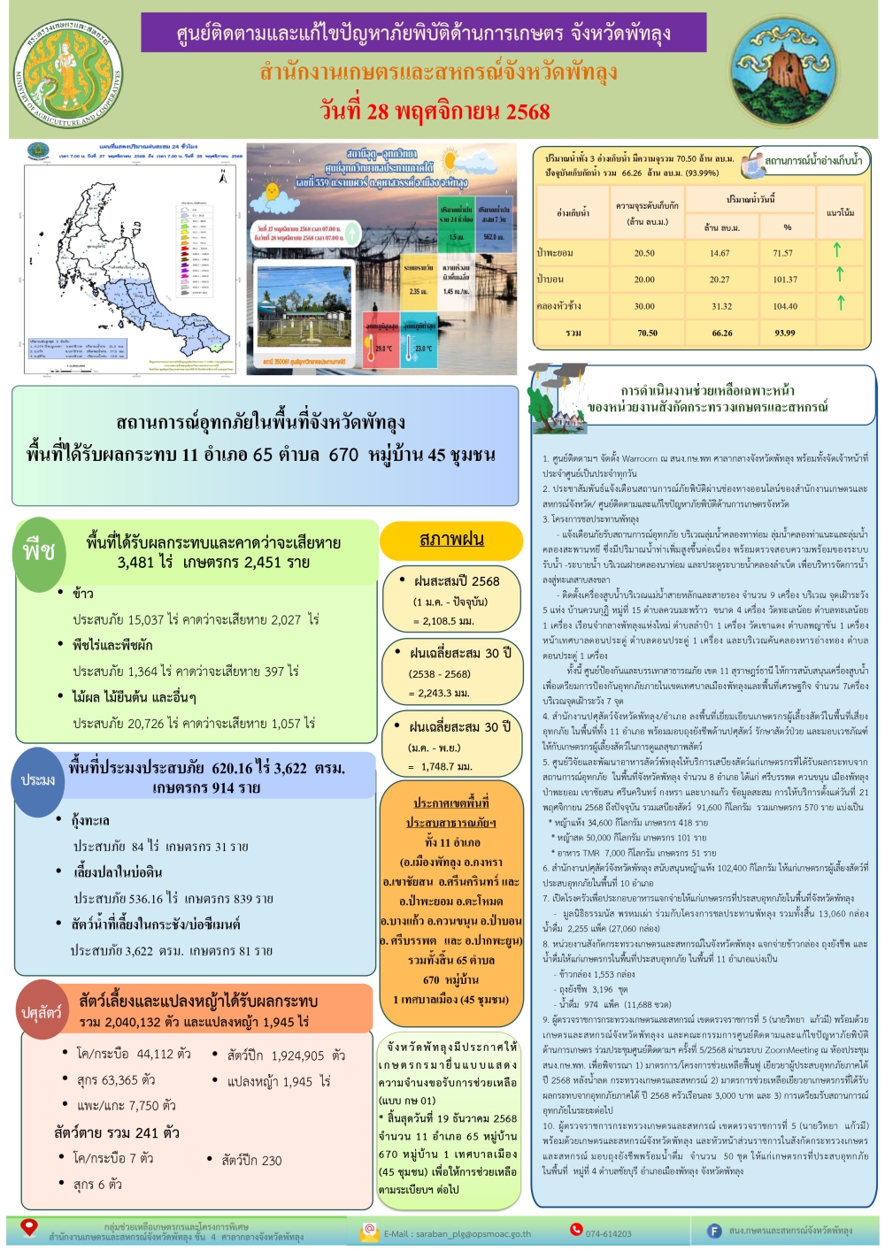 รายงานสถานการณ์ ศูนย์ติดตามและแก้ไขปัญหาภัยพิบัติด้านการเกษตร จังหวัดพัทลุง ณ วันที่ 28 พฤศจิกายน 2568