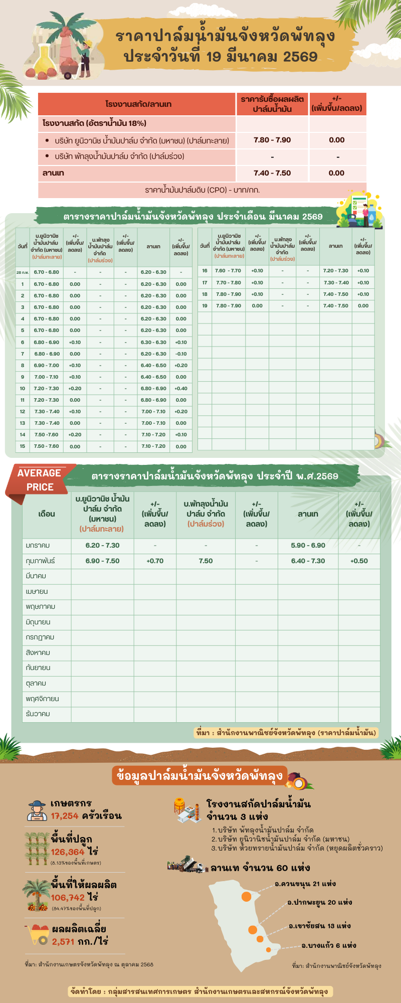 ราคาปาล์มน้ำมันประจำวันที่ 19 มีนาคม 2569