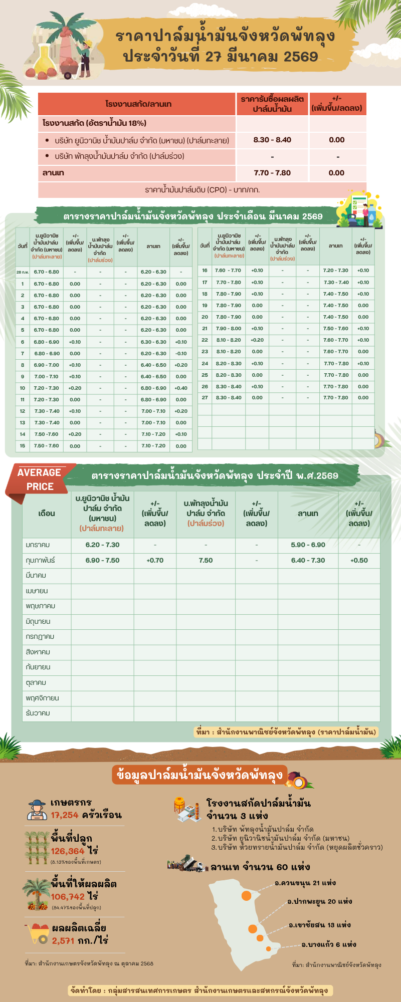 ราคาปาล์มน้ำมันประจำวันที่ 27 มีนาคม 2569