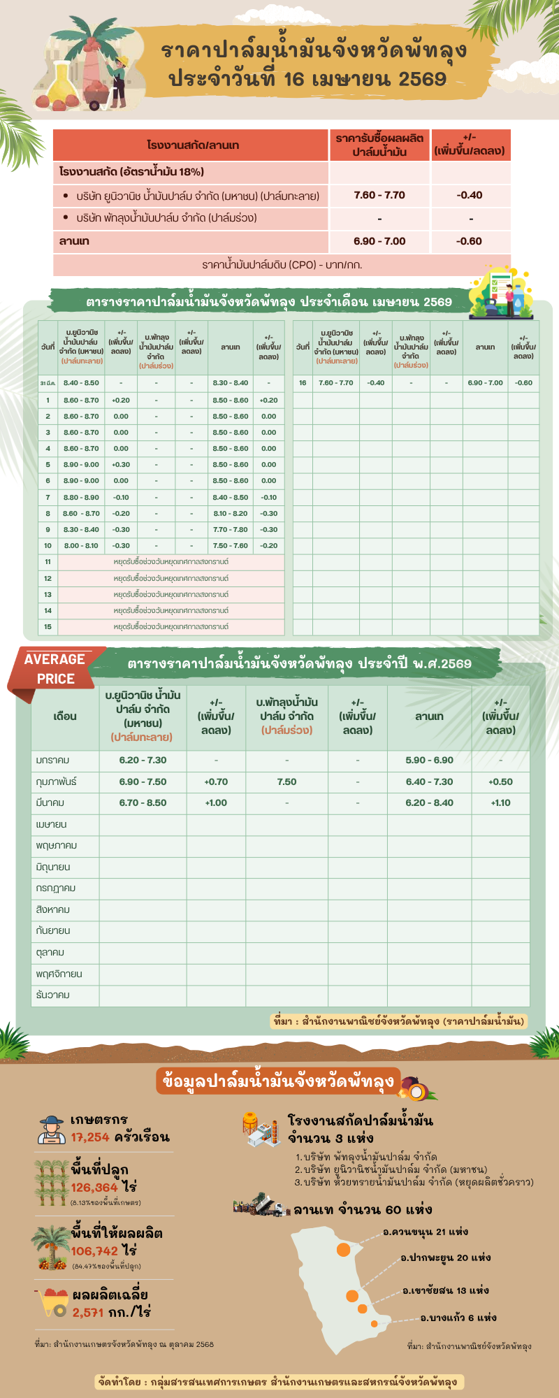 ราคาปาล์มน้ำมันประจำวันที่ 16 เมษายน 2569