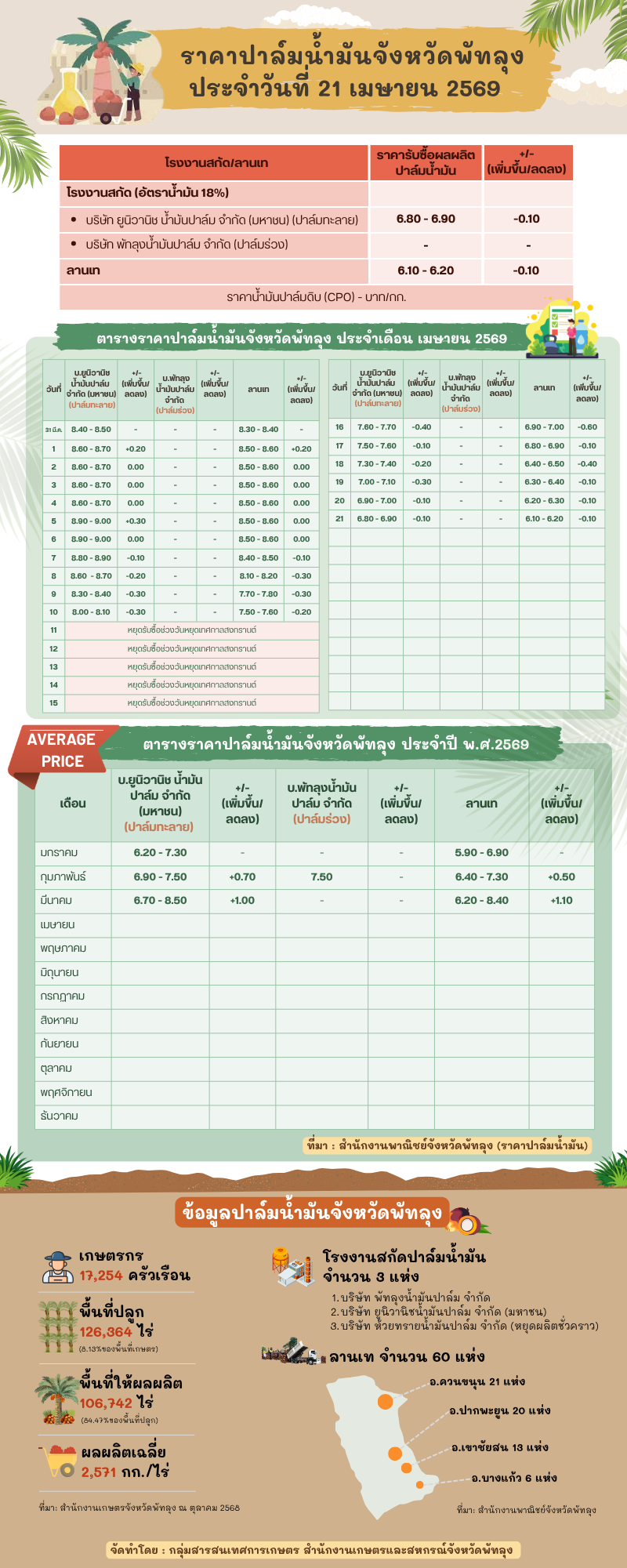 ราคาปาล์มน้ำมันประจำวันที่ 21 เมษายน 2569