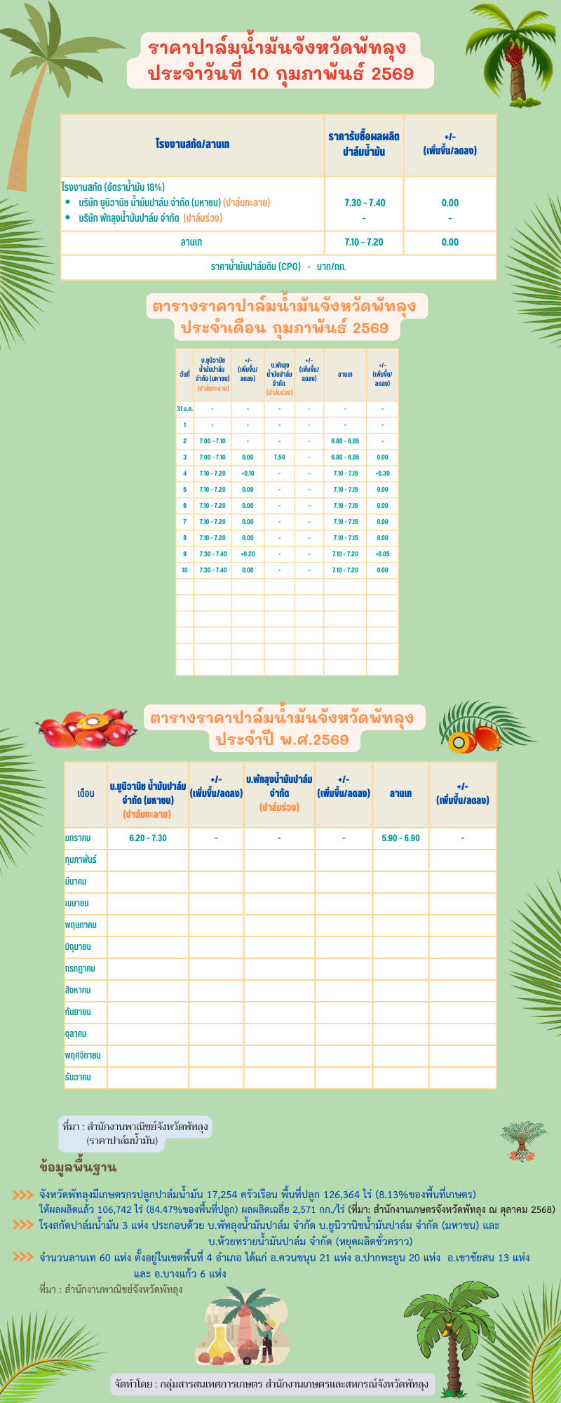 ราคาปาล์มน้ำมันประจำวันที่ 10 กุมภาพันธ์ 2569