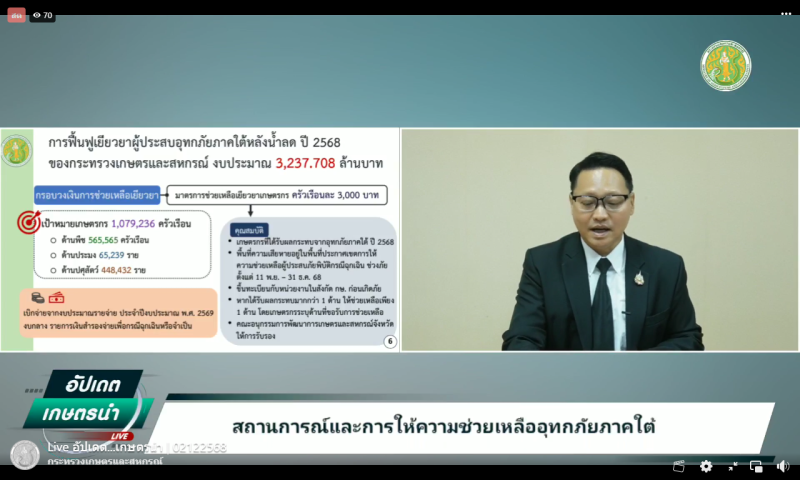 วันที่ 2 ธันวาคม 2568 เวลา 09.00 น. นางคัทลียา สิงหศิริ เกษตรและสหกรณ์จังหวัดพะเยา พร้อมด้วยข้าราชการและเจ้าหน้าที่สำนักงานเกษตรและสหกรณ์จังหวัดพะเยา ร่วมรับฟัง Live รายการอัปเดตเกษตรนำ ในหัวข้อ