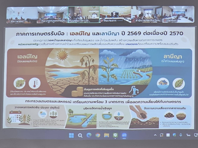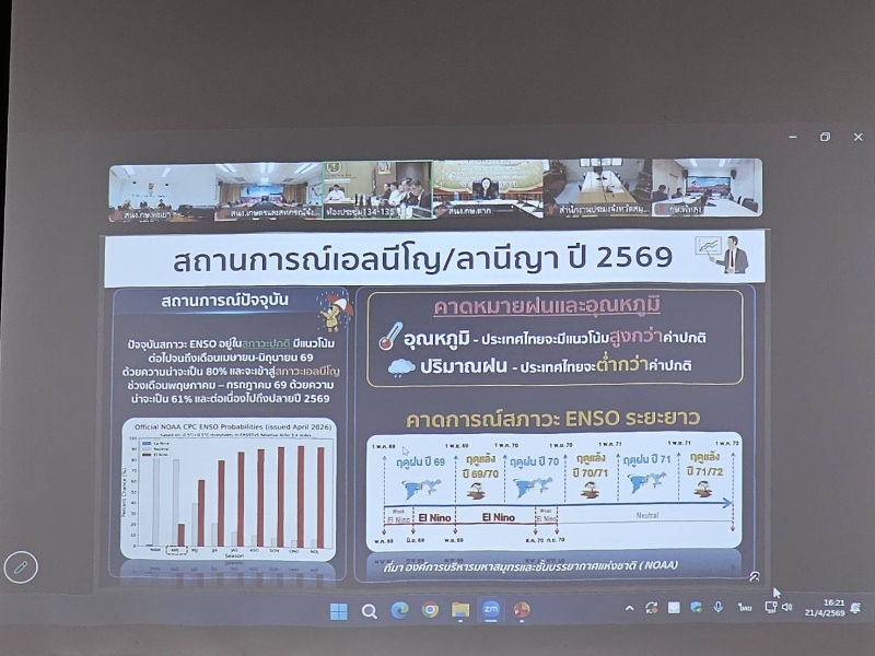 วันที่ 21 เมษายน พ.ศ.2569 เวลา 15.00 น. นางคัทลียา สิงหศิริ เกษตรและสหกรณ์จังหวัดพะเยา พร้อมด้วยเจ้าหน้าที่กลุ่มช่วยเหลือเกษตรกรและโครงการพิเศษ เข้าร่วมการประชุมศูนย์ติดตามและแก้ไขปัญหาภัยพิบัติด้านการเกษตร กระทรวงเกษตรและสหกรณ์ ครั้งที่ 1/2569 ผ่านระบบการประชุมออนไลน์ Zoom meeting โดยมีนายกฤษ อุตตมะเวทิน รองปลัดกระทรวงเกษตรและสหกรณ์ เป็นประธานในการประชุม เพื่อรับทราบสถานการณ์น้ำ และการบริหารจัดการน้ำ ปี 2568/69 และพิจารณาการเตรียมการวางแผนการเพาะปลูกพืช ปี 2569/70 ณ ห้องประชุมสำนักงานเกษตรและสหกรณ์จังหวัดพะเยา ชั้น 4 ศาลากลางจังหวัดพะเยา