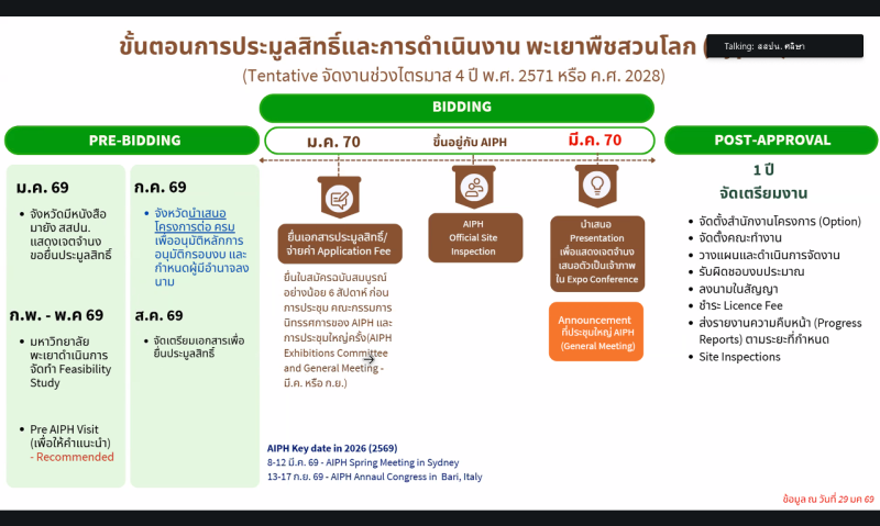 วันที่ 29 มกราคม 2569 เวลา 09.30 น. นางคัทลียา สิงหศิริ เกษตรและสหกรณ์จังหวัดพะเยา จัดประชุมหารือแนวทางการจัดทำแผนการดำเนินงาน และการจัดทำข้อมูลประกอบการการเสนอตัวเป็นเจ้าภาพการจัด งานมหกรรม พืชสวนโลก ปี พ.ศ. 2571 (ประเภท C) ร่วมกับผู้อำนวยการสำนักส่งเสริมการจัดประชุมและนิรรศการ ภาคเหนือ (สสปน.), ผู้อำนวยการสถาบันวิจัยพืชสวน กรมวิชาการเกษตร, รองอธิการบดี มหาวิทยาลัยพะเยา และหัวหน้าสำนักงานจังหวัดพะเยา ณ ห้องประชุมสำนักงานเกษตรและสหกรณ์จังหวัดพะเยา ชั้น 4 ศาลากลางจังหวัดพะเยา และผ่านระบบออนไลน์ Zoom Meeting