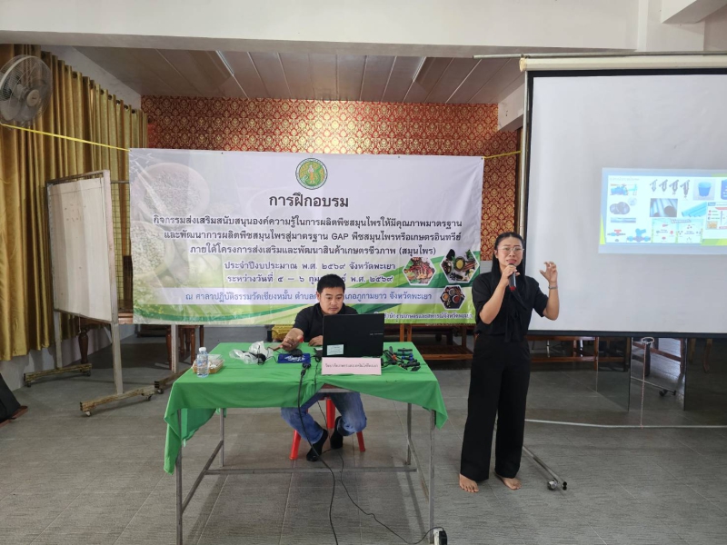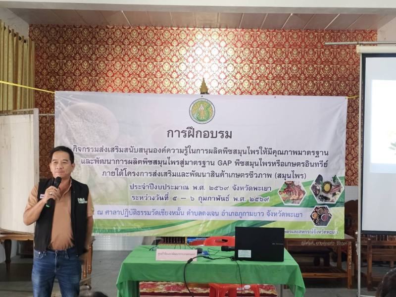 วันที่ 6 กุมภาพันธ์ พ.ศ. 2569 เวลา 08.30 น. นางคัทลียา สิงหศิริ เกษตรและสหกรณ์จังหวัดพะเยา มอบหมายให้นางสาวพรรษสรณ์ งุ่ยส่องแสวง หัวหน้ากลุ่มช่วยเหลือเกษตรกรและโครงการพิเศษ พร้อมด้วยเจ้าหน้าที่ ดำเนินการจัดฝึกอบรมการส่งเสริมสนับสนุนองค์ความรู้ในการผลิตพืชสมุนไพรให้มีคุณภาพมาตรฐานและพัฒนาการสู่มาตรฐาน GAP หรือเกษตรอินทรีย์ ภายใต้โครงการส่งเสริมและพัฒนาสินค้าเกษตรชีวภาพสมุนไพร ประจำปีงบประมาณ พ.ศ 2569 จังหวัดพะเยา โดยมีกลุ่มเกษตรกรเป้าหมาย เข้าร่วมจำนวน 33 ราย และมีวิทยากรจากศูนย์วิจัยและพัฒนาการเกษตรแพร่และวิทยาลัยเกษตรและเทคโนโลยีพะเยา ร่วมถ่ายทอดองค์ความรู้