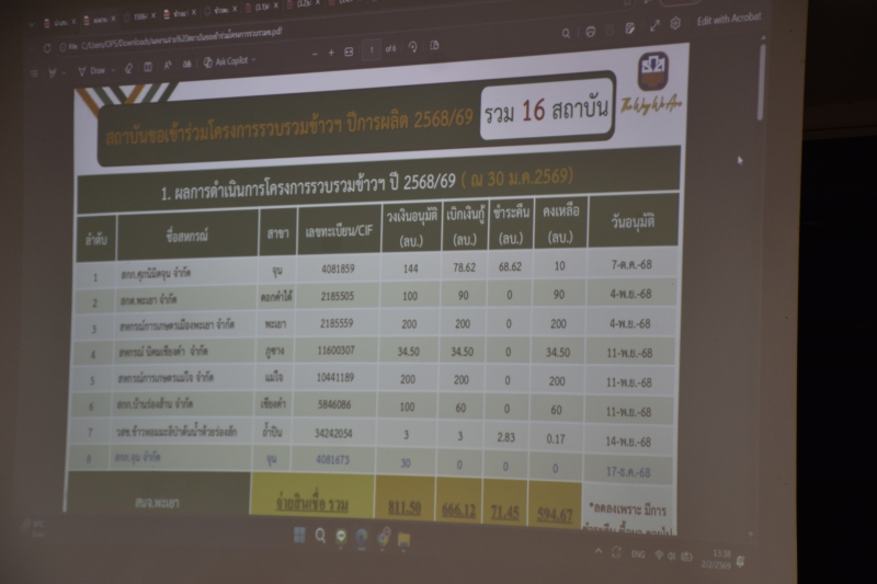 วันที่ 2 กุมภาพันธ์ 2569 เวลา 13.30 น. นางคัทลียา สิงหศิริ เกษตรและสหกรณ์จังหวัดพะเยา พร้อมด้วยเจ้าหน้าที่กลุ่มช่วยเหลือเกษตรกรและโครงการพิเศษ ร่วมประชุมคณะอนุกรรมการติดตามกำกับดูแลการบริหารจัดการข้าวระดับจังหวัด ครั้งที่ 1/2569 เพื่อขอรับเงินชดเชยดอกเบี้ย และรับรองข้อมูลการตรวจสอบสต๊อกข้าว ของผู้เข้าร่วมโครงการชดเชยดอกเบี้ยให้ผู้ประกอบการค้าข้าวในการเก็บสต๊อก ปีการผลิต 2567/68 โดยมี นายภูธนะ ชมภูมิ่ง รองผู้ว่าราชการจังหวัดพะเยา เป็นประธานการประชุม ณ ห้องประชุมจอมทอง ชั้น 4 ศาลากลางจังหวัดพะเยา
