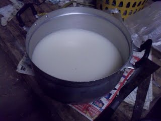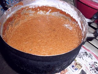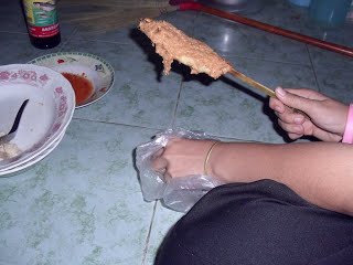 2.นำข้าวเหนียวแช่น้ำมาตำผสมกับกะทิและพริกแกง