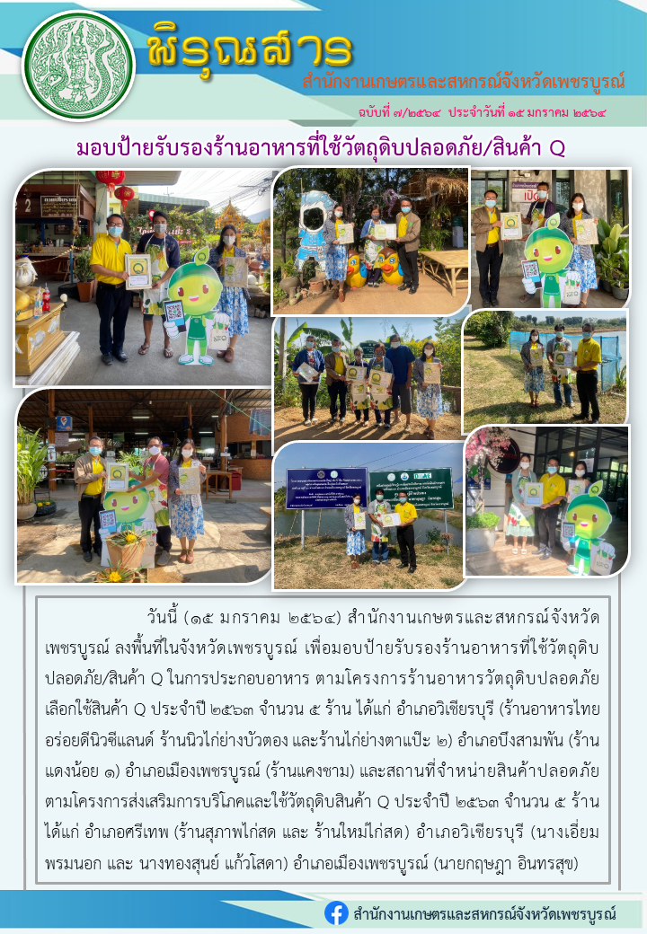 "พิรุณสาร" วันนี้ (15 มกราคม 2564) สำนักงานเกษตรและสหกรณ์จังหวัดเพชรบูรณ์ ลงพื้นที่ในจังหวัดเพชรบูรณ์ เพื่อมอบป้ายรับรองร้านอาหารที่ใช้วัตถุดิบปลอดภัย/สินค้า Q ในการประกอบอาหาร ตามโครงการร้านอาหารวัตถุดิบปลอดภัยเลือกใช้สินค้า Q ประจำปี 2563 จำนวน 5 ร้าน ได้แก่ อำเภอวิเชียรบุรี (ร้านอาหารไทยอร่อยดีนิวซีแลนด์ ร้านนิวไก่ย่างบัวตอง และร้านไก่ย่างตาแป๊ะ 2) อำเภอบึงสามพัน (ร้านแดงน้อย 1) อำเภอเมืองเพชรบูรณ์ (ร้านแคงชาม) และสถานที่จำหน่ายสินค้าปลอดภัย ตามโครงการส่งเสริมการบริโภคและใช้วัตถุดิบสินค้า Q ประจำปี 2563 จำนวน 5 ร้าน ได้แก่ อำเภอศรีเทพ (ร้านสุภาพไก่สด และ ร้านใหม่ไก่สด) อำเภอวิเชียรบุรี (นางเอี่ยม พรมนอก และ นางทองสุนย์ แก้วโสดา) อำเภอเมืองเพชรบูรณ์ (นายกฤษฎา อินทรสุข)