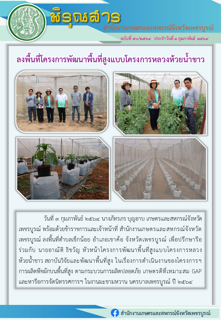 "พิรุณสาร" วันที่ 3 กุมภาพันธ์ 2564 นางภัทรภร บุญอาบ เกษตรและสหกรณ์จังหวัดเพชรบูรณ์ พร้อมด้วยข้าราชการและเจ้าหน้าที่ สำนักงานเกษตรและสหกรณ์จังหวัดเพชรบูรณ์ ลงพื้นที่ตำบลเข็กน้อย อำเภอเขาค้อ จังหวัดเพชรบูรณ์ เพื่อปรึกษารือร่วมกับ นายอาณัติ ธิขวัญ หัวหน้าโครงการพัฒนาพื้นที่สูงแบบโครงการหลวงห้วยน้ำขาว สถาบันวิจัยและพัฒนาพื้นที่สูง ในเรื่องการดำเนินงานของโครงการฯการผลิตพืชผักบนพื้นที่สูง ตามกระบวนการผลิตปลอดภัย เกษตรดีที่เหมาะสม GAP และหารือการจัดนิทรรศการฯ ในงานมะขามหวาน นครบาลเพชรบูรณ์ ปี 2564