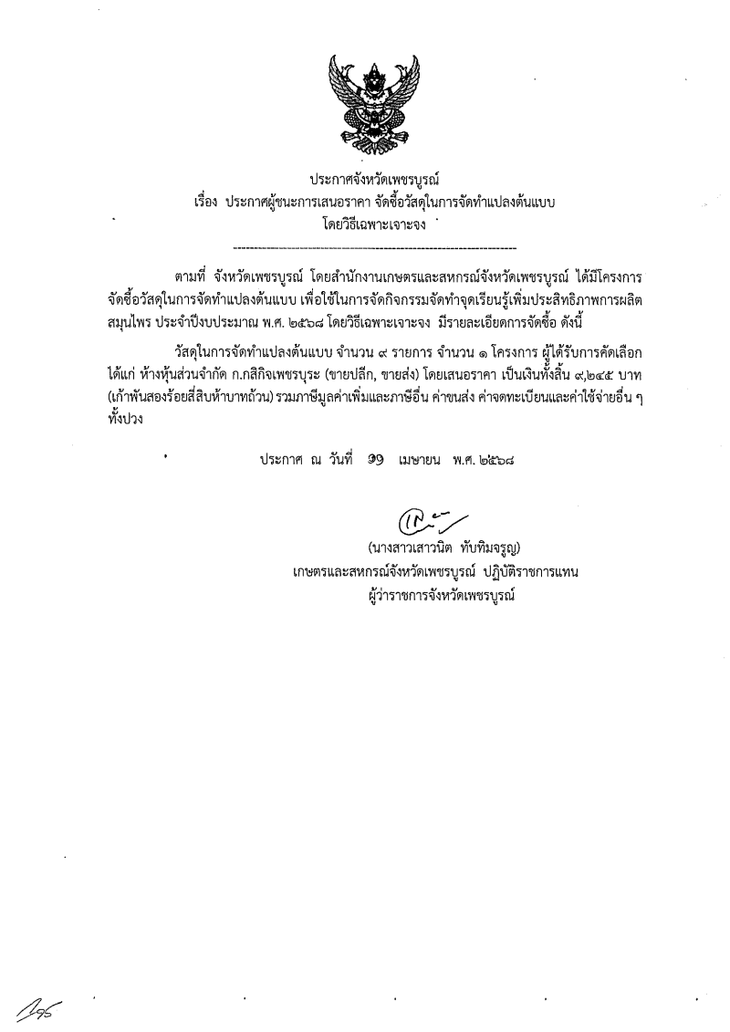 ประกาศผู้ชนะการเสนอราคา จัดซื้อวัสดุในการจัดทำแปลงตันแบบ โดยเฉพาะเจาะจง