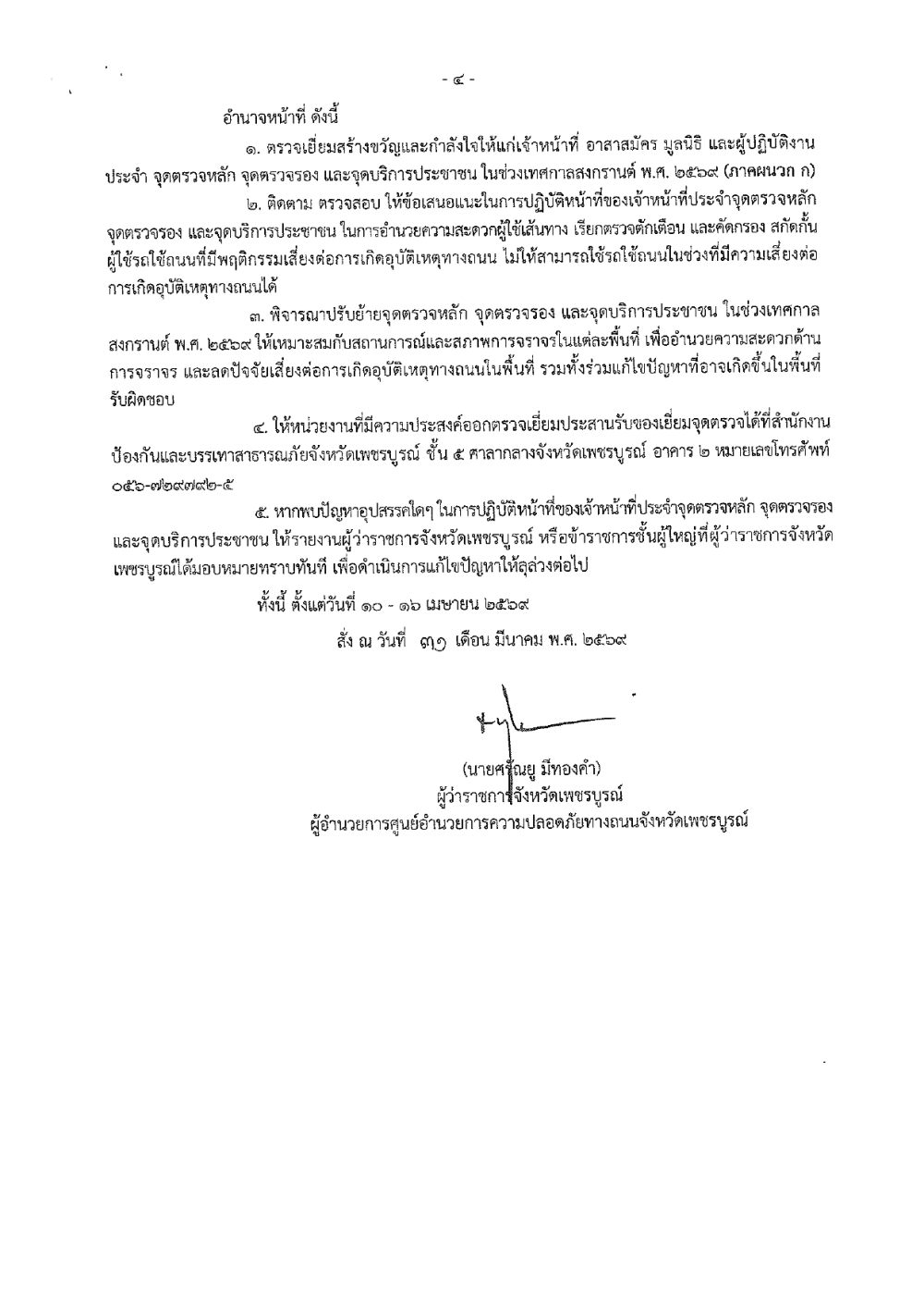 คำสั่งศูนย์อำนวยการความปลอดภัยทางถนนจังหวัดเพชรบูรณ์ ที่ 813/2569 ลงวันที่ 31 มีนาคม 2569 เรื่อง แต่งตั้งคณะทำงานตรวจเยี่ยมการปฏิบัติงานประจำจุดตรวจหลัก จุดตรวจรอง และจุดบริการประชาชนช่วงเทศกาลสงกรานต์ พ.ศ.2569 จังหวัดเพชรบูรณ์