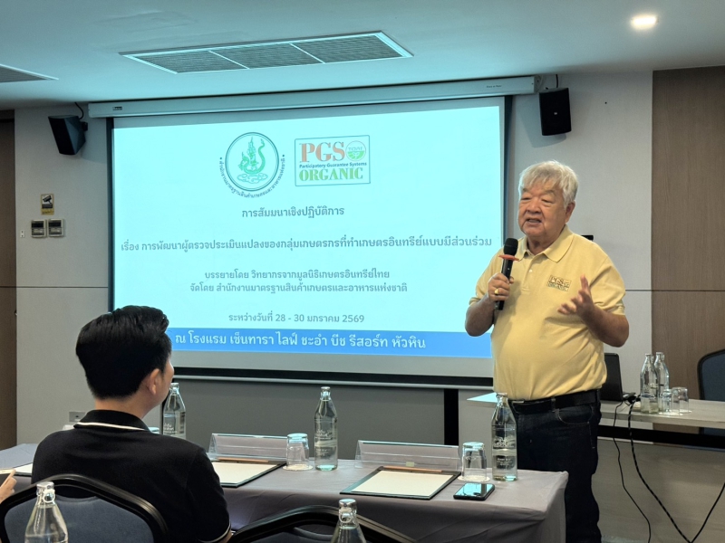 วันพุธที่ 28 มกราคม พ.ศ. 2569 เวลา 09.00 น. นางสาวศิรวรรณ เครือเล็ก เกษตรและสหกรณ์จังหวัดเพชรบุรี มอบหมาย นางสาวสุกัญญา จัตตุพรพงษ์ นักวิเคราะห์นโยบายและแผนชำนาญการพิเศษ หัวหน้ากลุ่มยุทธศาสตร์พัฒนาการเกษตร เข้าร่วมการสัมมนาเชิงปฏิบัติการ เรื่อง การพัฒนาผู้ตรวจประเมินแปลงของกลุ่มเกษตรกรที่ทําเกษตรอินทรีย์แบบมีส่วนร่วม (Participatory Guarantee System: PGS) จำนวน 3 วัน ระหว่างวันที่ 28-30 มกราคม 2569 ณ โรงแรมเซ็นทาราไลฟ์ ชะอําบีช รีสอร์ท หัวหิน จัดโดยสำนักงานมาตรฐานสินค้าเกษตรและอาหารแห่งชาติ มีวัตถุประสงค์เพื่อสนับสนุนการรวมกลุ่มของเกษตรกรในการผลิตสินค้าเกษตรอินทรีย์ด้วยระบบการรับรองแบบมีส่วนร่วม (PGS) เพื่อสร้างความรู้ ความเข้าใจของเกษตรกรเกี่ยวกับมาตรฐานเกษตรอินทรีย์ และสนับสนุนให้กลุ่มเกษตรกรได้ขึ้นทะเบียนกับมูลนิธิเกษตรอินทรีย์ไทย ซึ่งในวันที่ 1 มีการบรรยายให้ความรู้ เรื่อง - เกษตรอินทรีย์กับระบบการรับรองแบบมีส่วนร่วม - มาตรฐานเกษตรอินทรีย์ (มกษ.๙๐๐๐-๒๕๖๔) และมาตรฐานเกษตรอินทรีย์แบบมีส่วนร่วม - กระบวนการเกษตรอินทรีย์แบบมีส่วนร่วม เช่น การวิเคราะห์สถานการณ์กลุ่ม การจัดทําโครงสร้างบริหารจัดการกลุ่ม และการกําหนดมาตรฐานเกษตรอินทรีย์ของกลุ่ม - ขั้นตอนการขอการรับรองมาตรฐานเกษตรอินทรีย์ (มกษ.๙๐๐๐-๒๕๖๔)