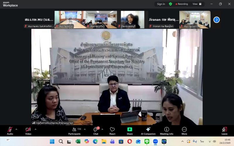 วันอังคารที่ 24 กุมภาพันธ์ พ.ศ. 2569 เวลา 10.00 น. นางสาวศิริวรรณ เครือเล็ก เกษตรและสหกรณ์จังหวัดเพชรบุรี พร้อมด้วยหัวหน้ากลุ่ม/ฝ่าย และเจ้าหน้าที่ผู้ปฏิบัติ ร่วมประชุมหารือเพื่อเตรียมการบริหารงบประมาณ ปี 2569 ในช่วงครึ่งปีหลัง (เม.ย - ก.ย. 2569) โดยมี ผู้อำนวยการสำนักแผนงานและโครงการพิเศษ (นางสาวพรชาตา บุสสุวัณโณ) สำนักงานปลัดกระทรวงเกษตรและสหกรณ์ เป็นประธาน ผ่านระบบออนไลน์ zoom