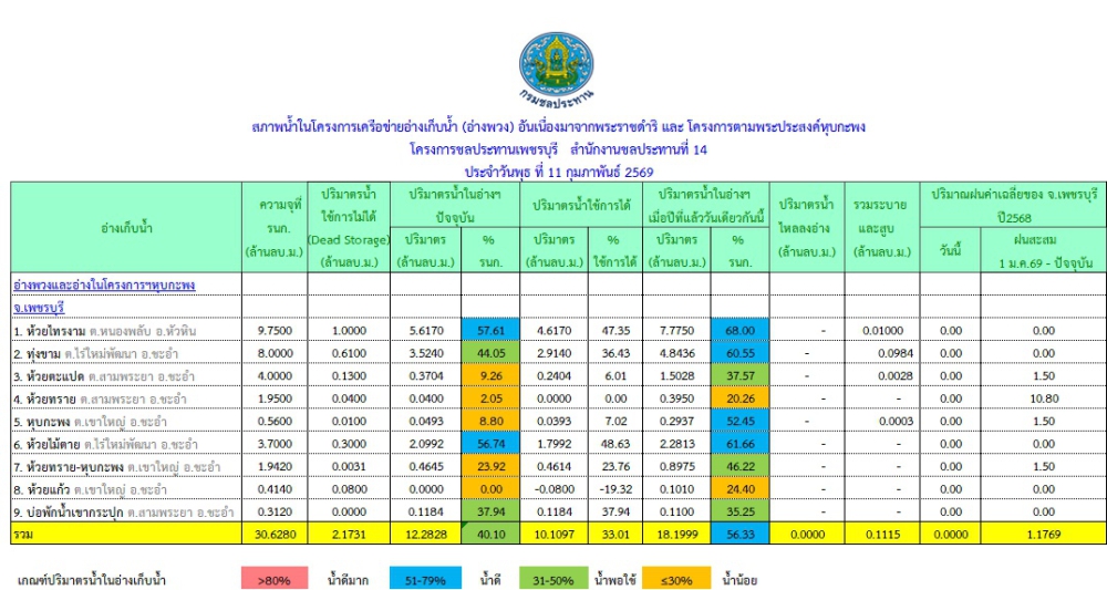 สถานการณ์น้ำในอ่างเก็บน้ำขนาดใหญ่และขนาดกลาง ประจำวันที่ 11 กุมภาพันธ์ 2569