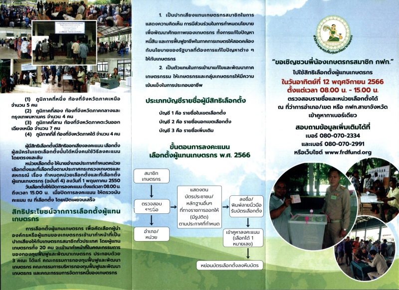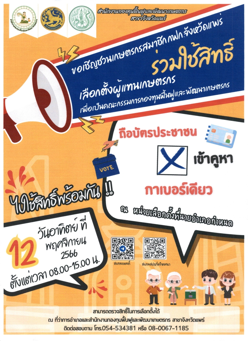 สำนักงานกองทุนฟื้นฟูและพัฒนาเกษตรกร สาขาจังหวัดแพร่ ประชาสัมพันธ์การเลือกตั้งผู้แทนเกษตรกร พ.ศ.2566 โดยให้เกษตรกรที่เป็นสมาชิกกองทุนฟืนฟูและพัฒนาเกษตรกร สาขาจังหวัดแพร่ มาใช้สิทธิเลือกตั้ง ในวันอาทิตย์ที่ 12 พฤศจิกายน 2566 ตั้งแต่เวลา 08.00 - 15.00 น. โดยนำบัตรประจำตัวประชาชนไปใช้สิทธิเลือกตั้ง กา (X) เพียงเบอร์เดียว ณ หน่วยเลือกตั้งที่อำเภอกำหนด