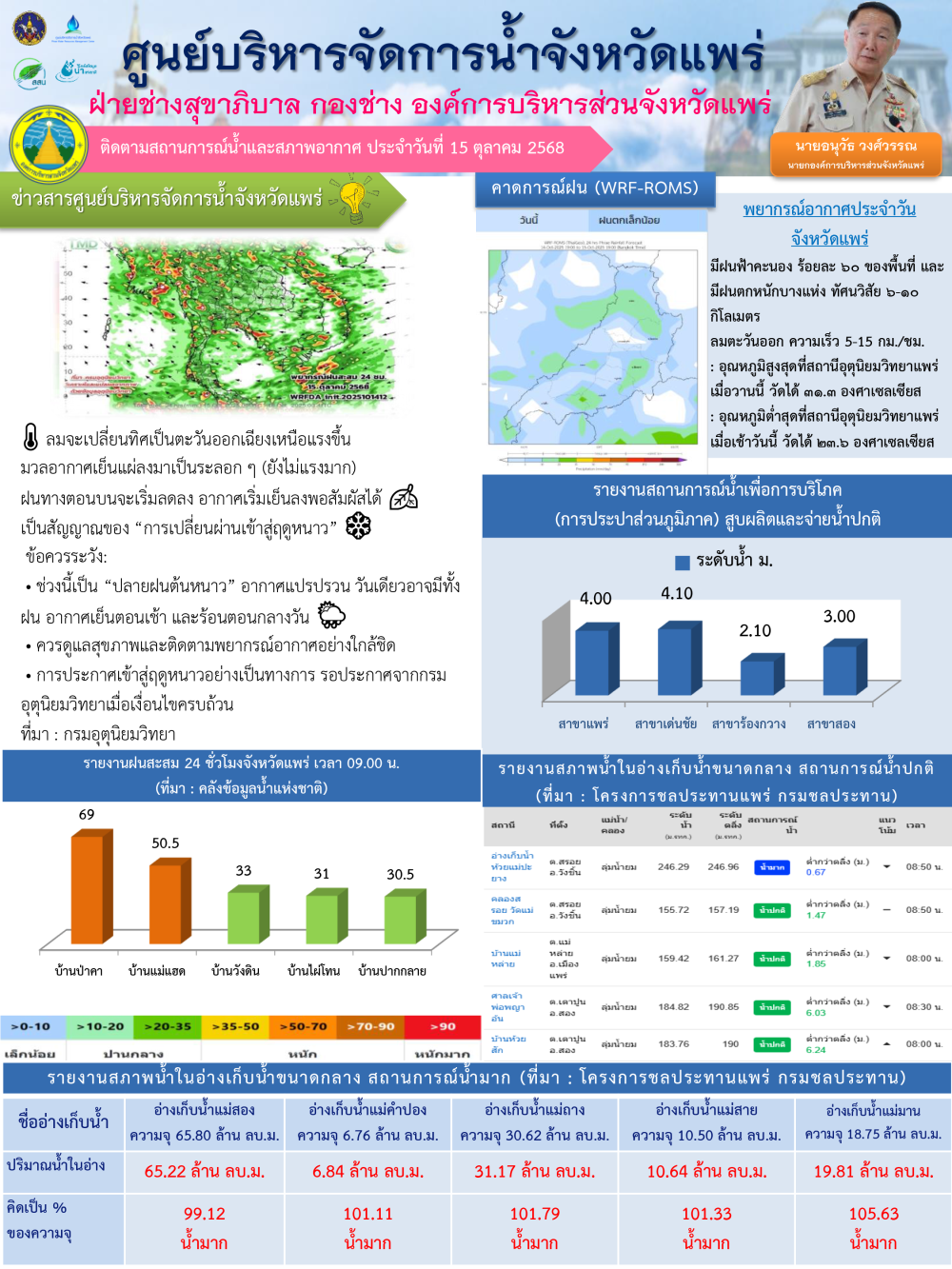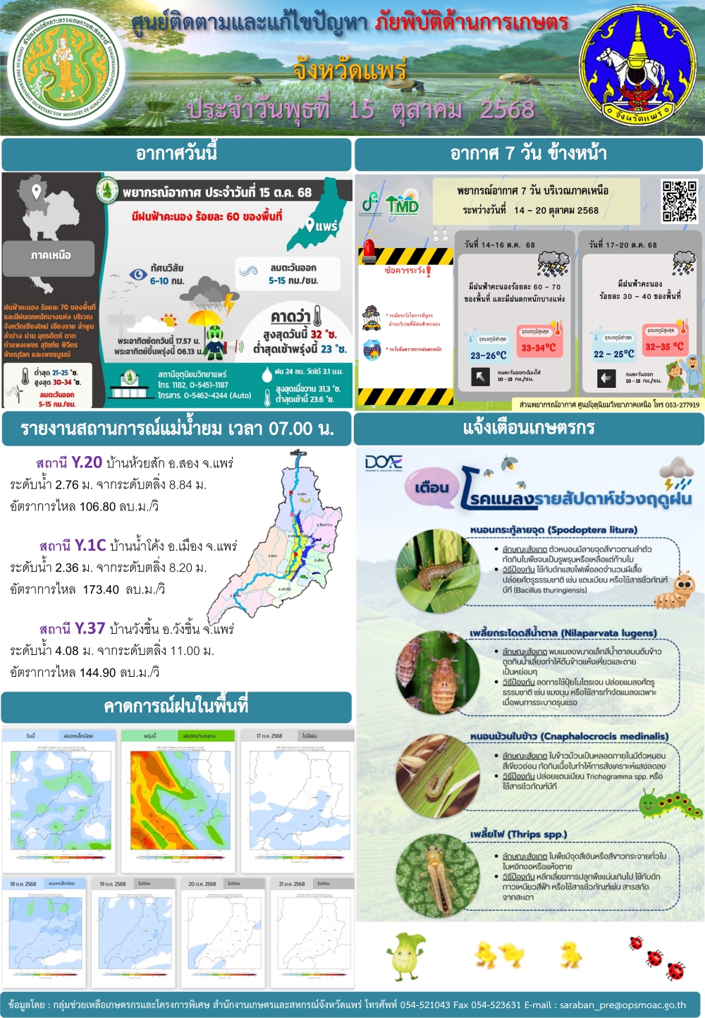 ศูนย์ติดตามและแก้ไขปัญหาภัยพิบัติด้านการเกษตรจังหวัดแพร่ (ประจำวันที่ 15 ตุลาคม 2568)