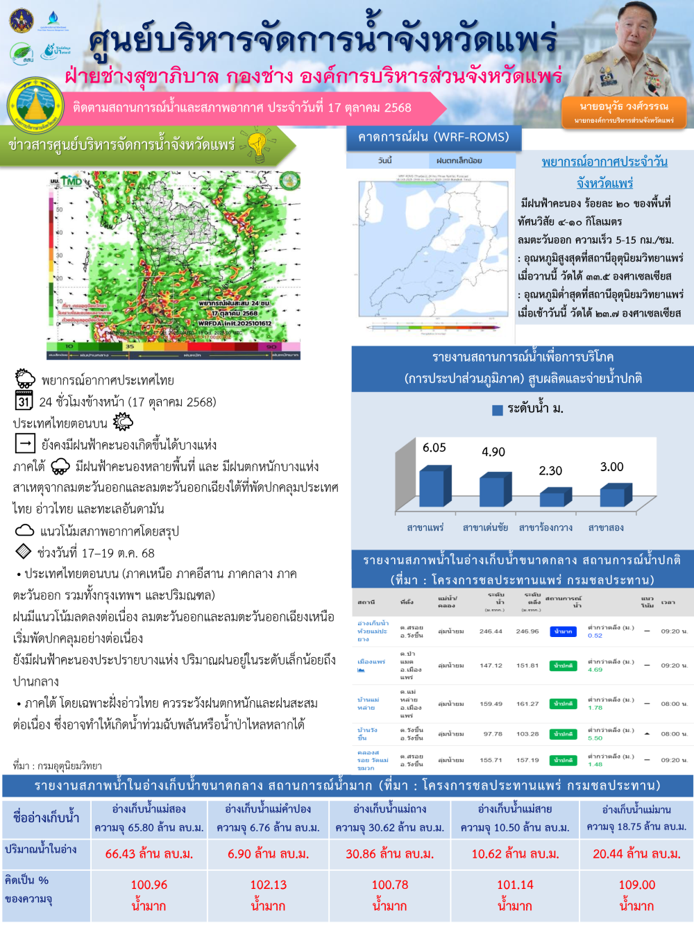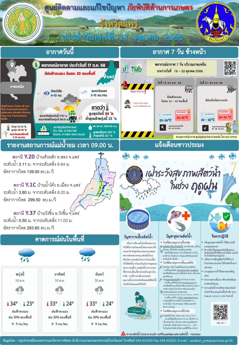 ศูนย์ติดตามและแก้ไขปัญหาภัยพิบัติด้านการเกษตรจังหวัดแพร่ (ประจำวันที่ 17 ตุลาคม 2568)