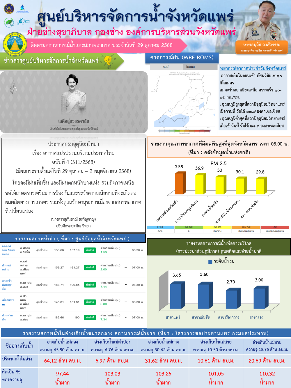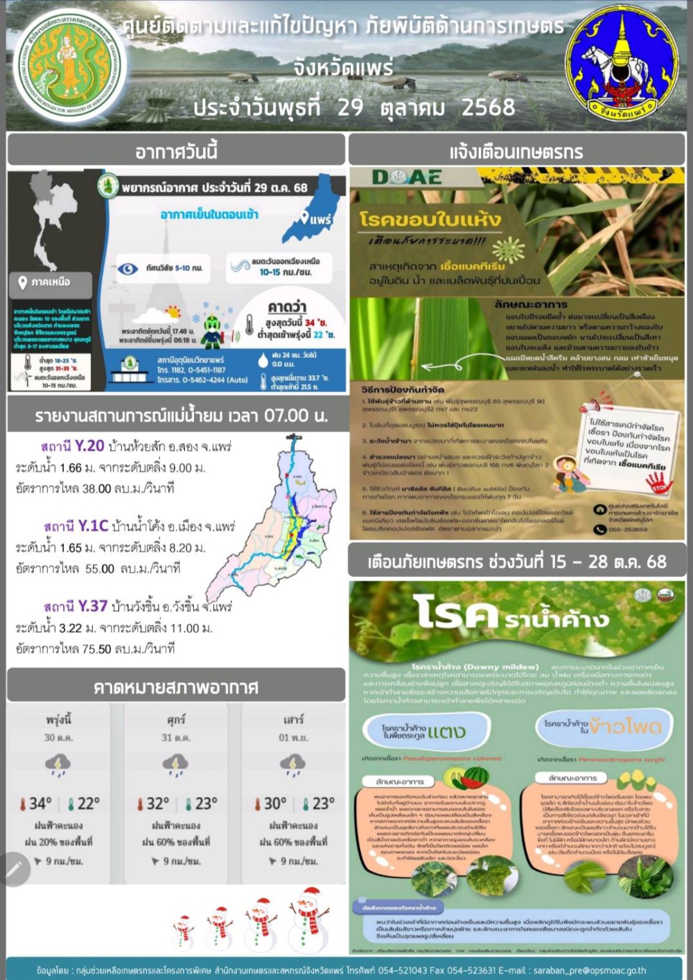 ศูนย์ติดตามและแก้ไขปัญหาภัยพิบัติด้านการเกษตรจังหวัดแพร่ (ประจำวันที่ 29 ตุลาคม 2568)