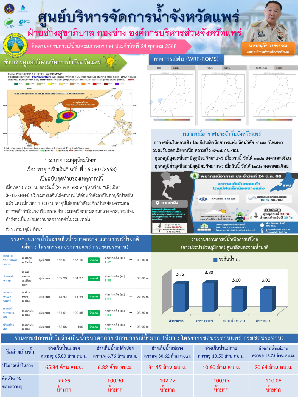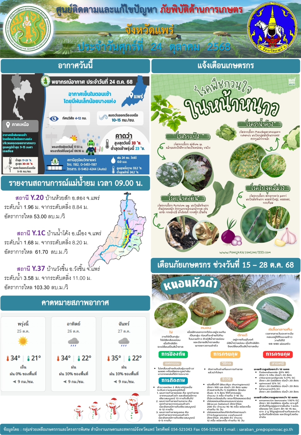 ศูนย์ติดตามและแก้ไขปัญหาภัยพิบัติด้านการเกษตรจังหวัดแพร่ (ประจำวันที่ 24 ตุลาคม 2568)