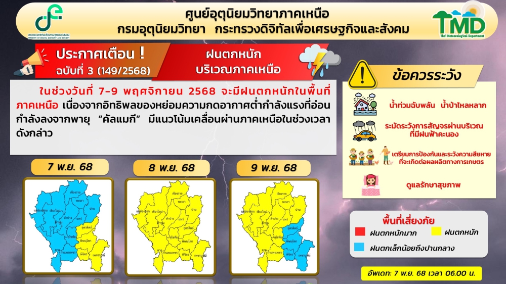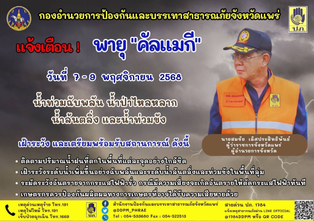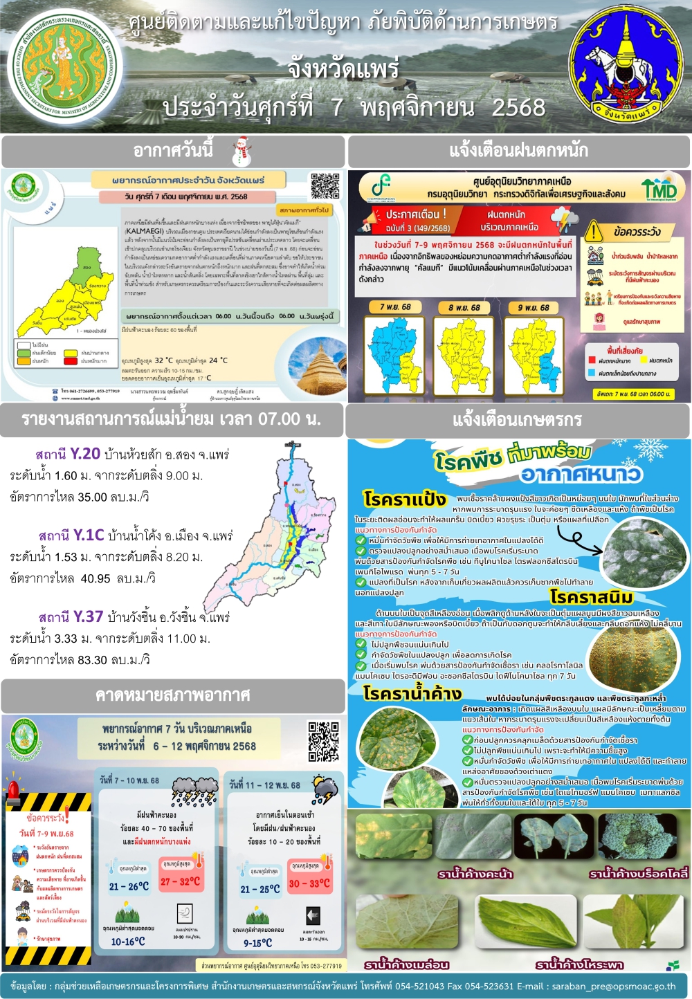 ศูนย์ติดตามและแก้ไขปัญหาภัยพิบัติด้านการเกษตรจังหวัดแพร่ (ประจำวันที่ 7 พฤศจิกายน 2568)