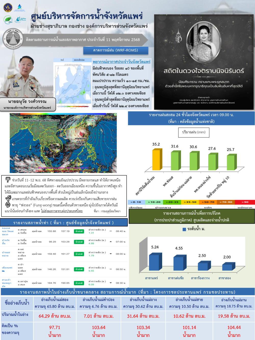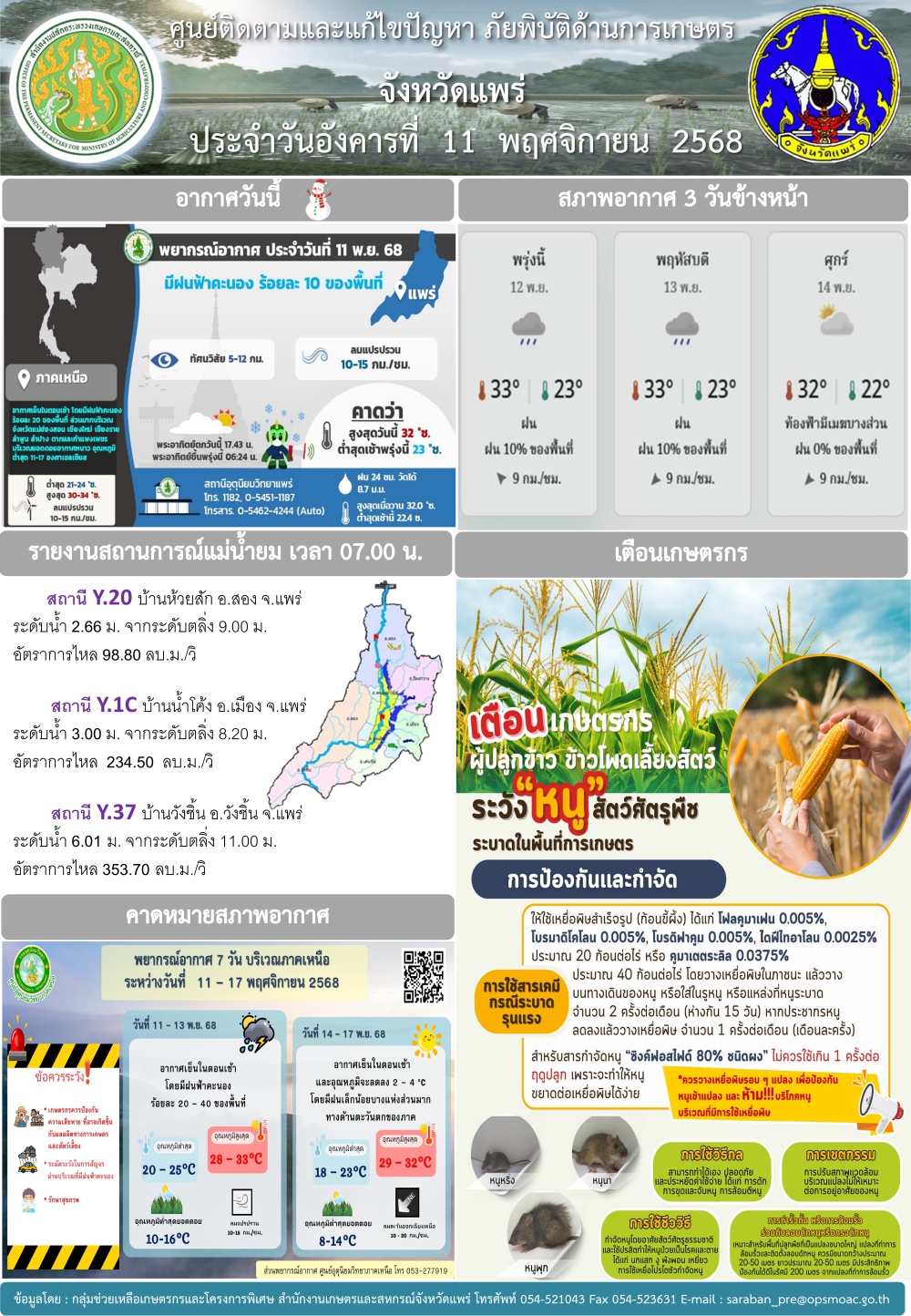 ศูนย์ติดตามและแก้ไขปัญหาภัยพิบัติด้านการเกษตรจังหวัดแพร่ (ประจำวันที่ 11 พฤศจิกายน 2568)