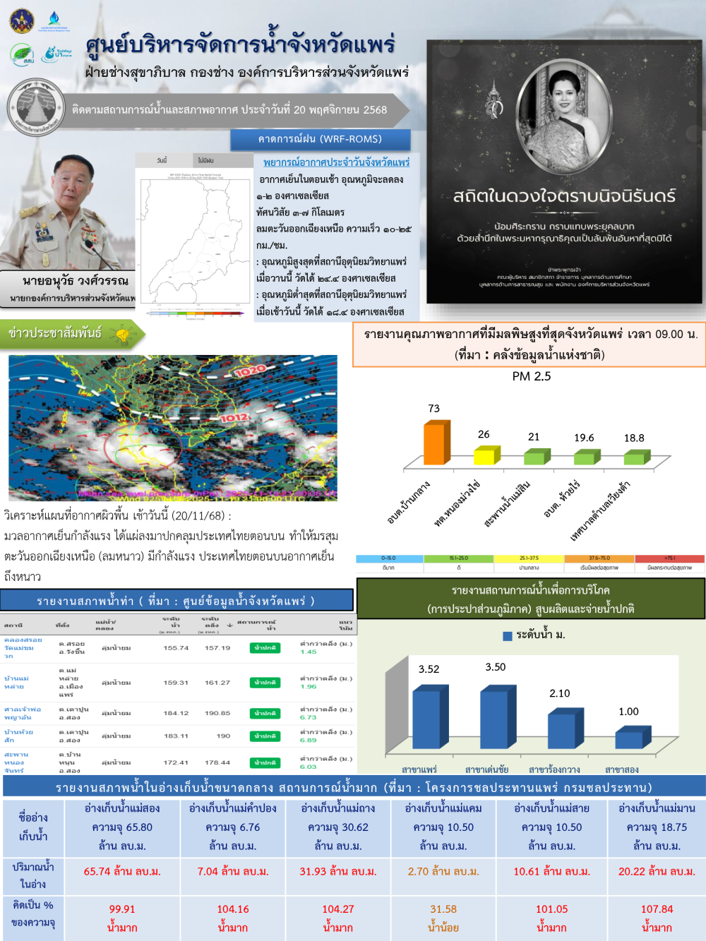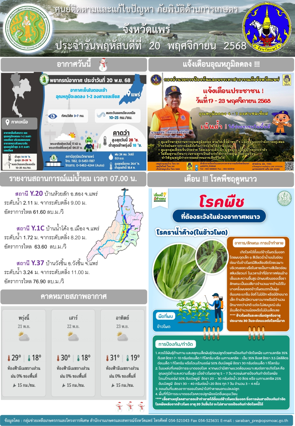 ศูนย์ติดตามและแก้ไขปัญหาภัยพิบัติด้านการเกษตรจังหวัดแพร่ (ประจำวันที่ 20 พฤศจิกายน 2568)