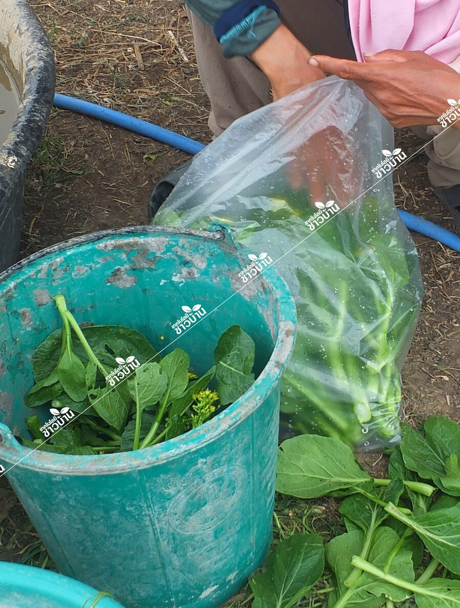 จัดผักกวางตุ้งอินทรีย์ใส่ถุงเตรียมส่งขาย