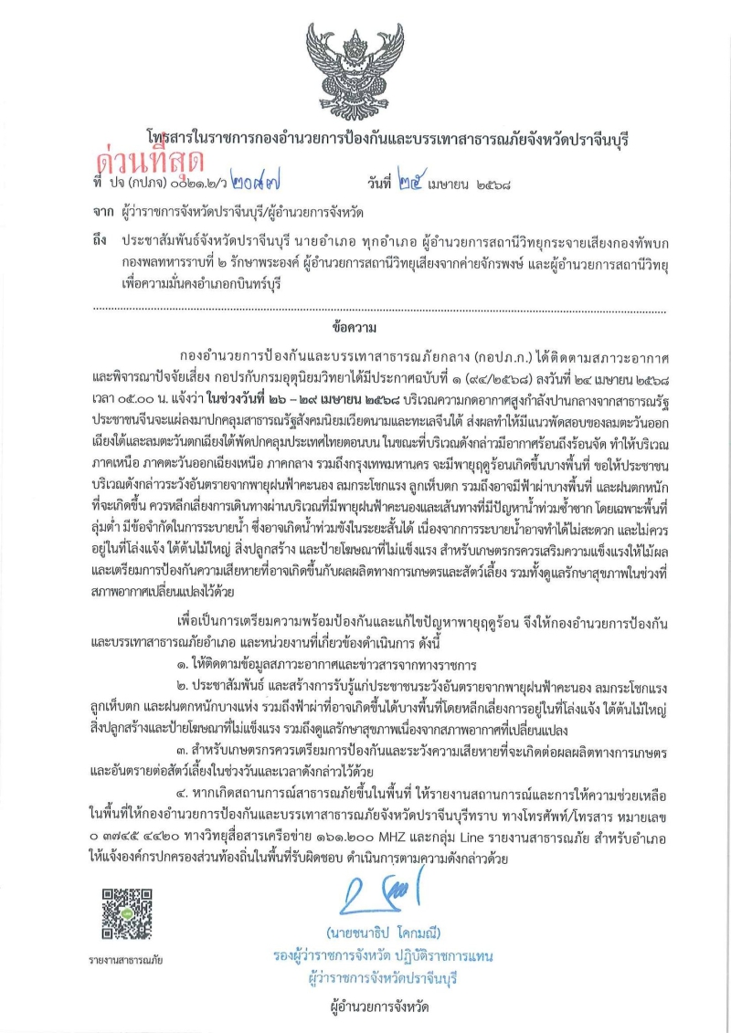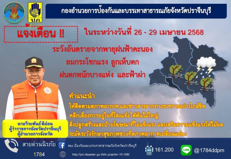 นายวีระพันธ์ ดีอ่อน ผู้ว่าฯ ปราจีนบุรี ผู้อำนวยการกองอำนวยการป้องกันและบรรเทาสาธารณภัยจังหวัดปราจีนบุรี แจ้งเตือนประชาชนให้ระวังอันตรายจากพายุฝนฟ้าคะนอง ลมกระโชกแรง ลูกเห็บตก ฝนตกหนักบางแห่ง และฟ้าผ่า ในช่วงวันที่ 26 - 29 เมษายน 2568