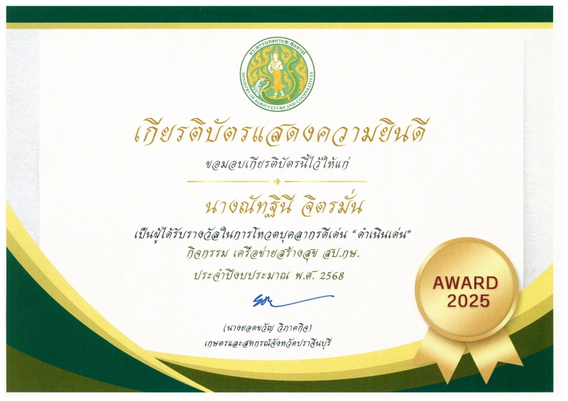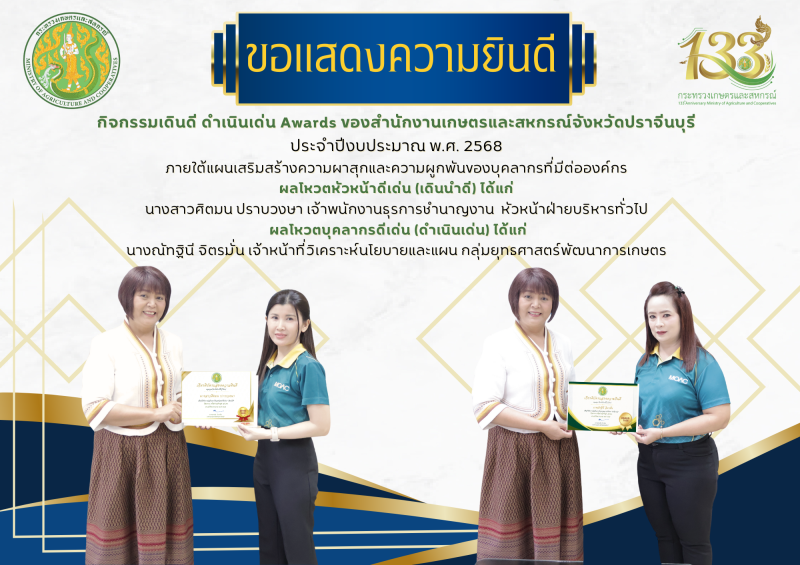 #โดยผลโหวตหัวหน้าดีเด่น (เดินนำดี) ได้แก่ นางสาวศิตมน ปราบวงษา เจ้าพนักงานธุรการชำนาญงาน หัวหน้าฝ่ายบริหารทั่วไป และผลโหวตบุคลากรดีเด่น (ดำเนินเด่น) ได้แก่ นางณัทฐินี จิตรมั่น เจ้าหน้าที่วิเคราะห์นโยบายและแผน กลุ่มยุทธศาสตร์พัฒนาการเกษตร