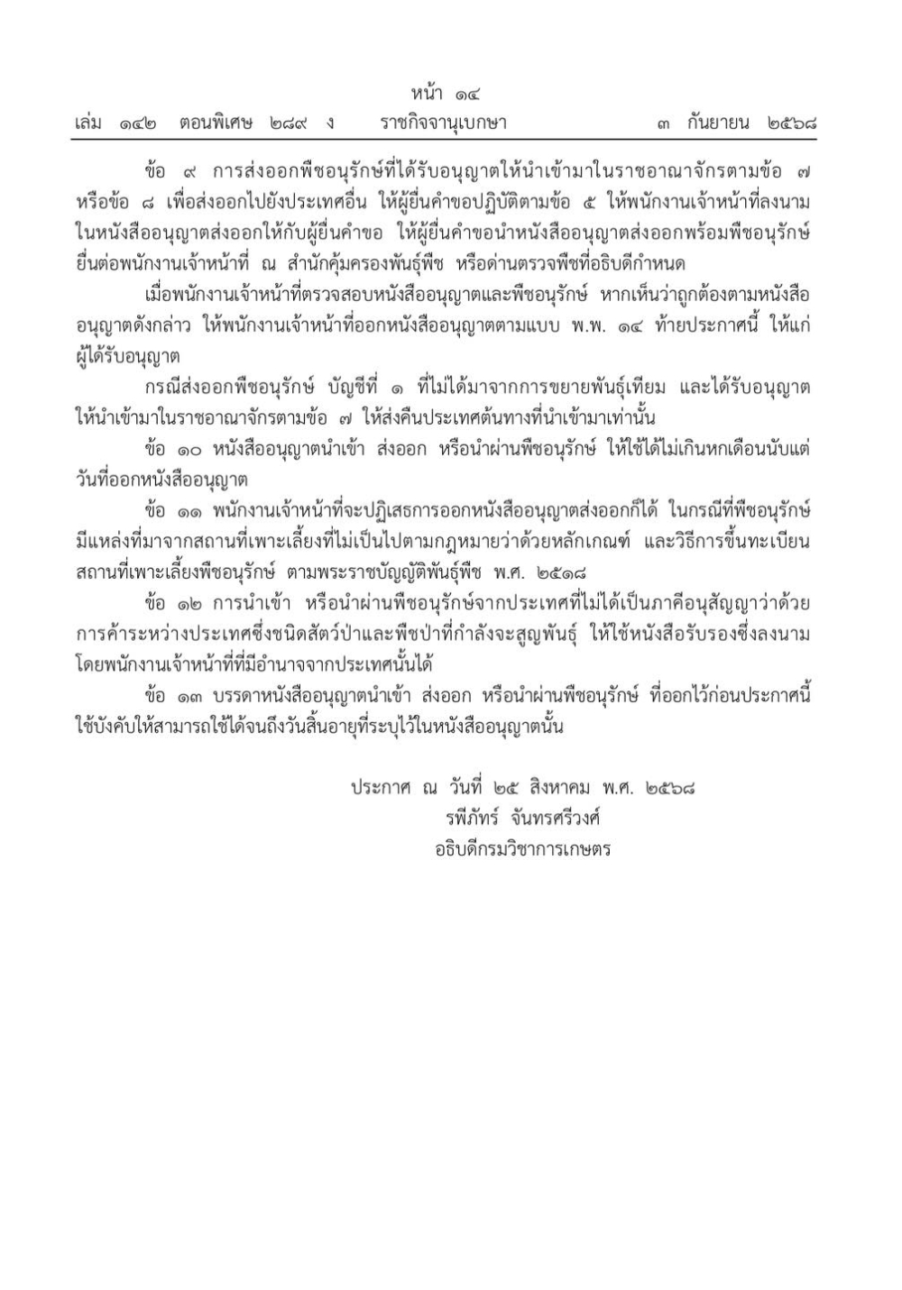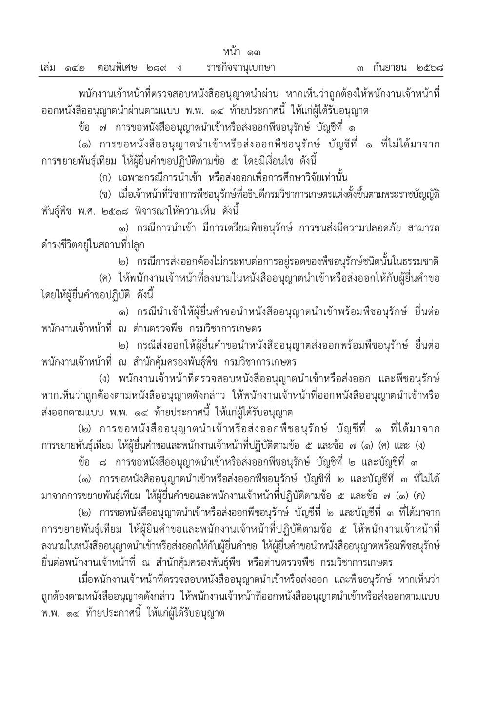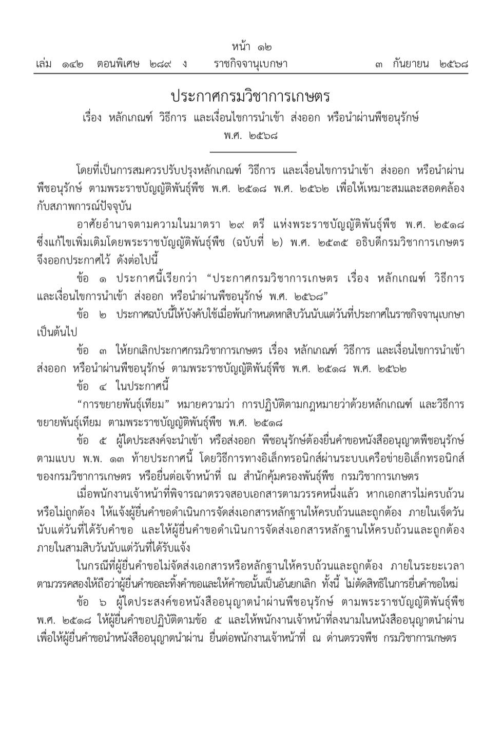 ประกาศกรมวิชาการเกษตร เรื่อง หลักเกณฑ์ วิธีการ และเงื่อนไขการนำเข้า ส่งออก หรือนำผ่านพืชอนุรักษ์ พ.ศ. ๒๕๖๘ดูรายละเอียดhttps:/ /ratchakitcha.soc.go.th/documents/83996.pdf