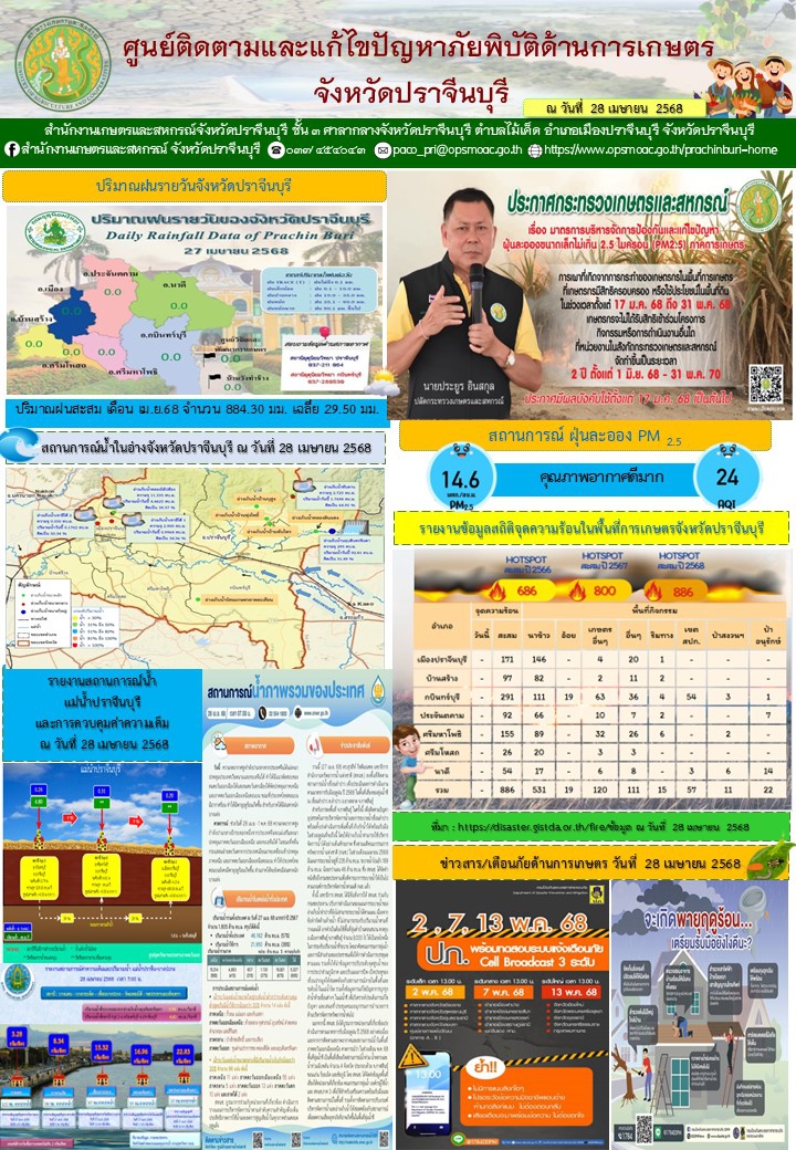 ศูนย์ติดตามและแก้ไขปัญหาภัยพิบัติด้านการเกษตร จังหวัดปราจีนบุรี ประจำวันที่ 28 เมษายน 2568