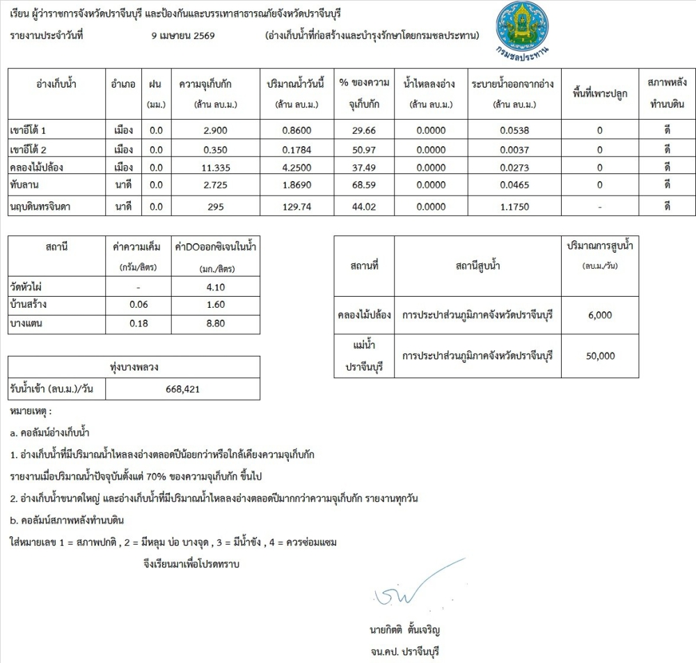รายงานสถานการณ์น้ำ ประจำวันที่ 9 เมษายน 2569
