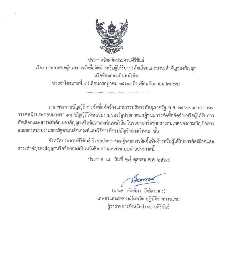 สรุปประกาศผู้ชนะจัดซื้อจัดจ้างหรือผู้ได้รับการคัดเลือกและสาระสำคัญของสัญญาหรือข้อตกลงเป็นหนังสือ ประจำไตรมาสที่ 4 (เดือน ก.ค. - ก.ย. 68)