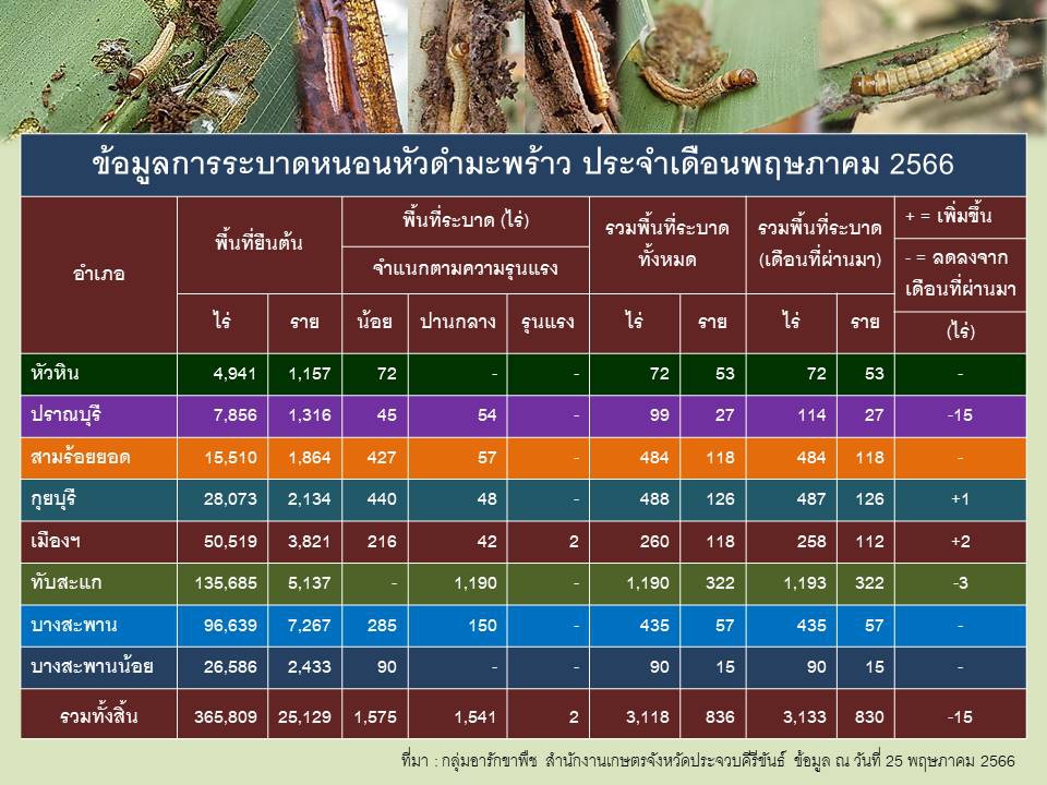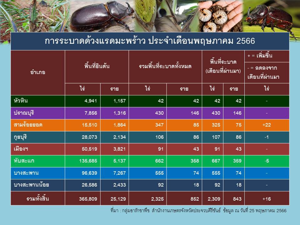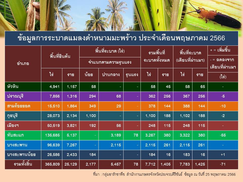 สรุปสถานการณ์การระบาดศัตรูมะพร้าว ประจำเดือนพฤษภาคม 2566 พบมีการะบาดในพื้นที่ 8 อำเภอ ของจังหวัดประจวบคีรีขันธ์ พื้นที่ยืนต้นรวมทั้งสิ้น 365,809 ไร่ เกษตรกร 25,129 ราย ดังนี้