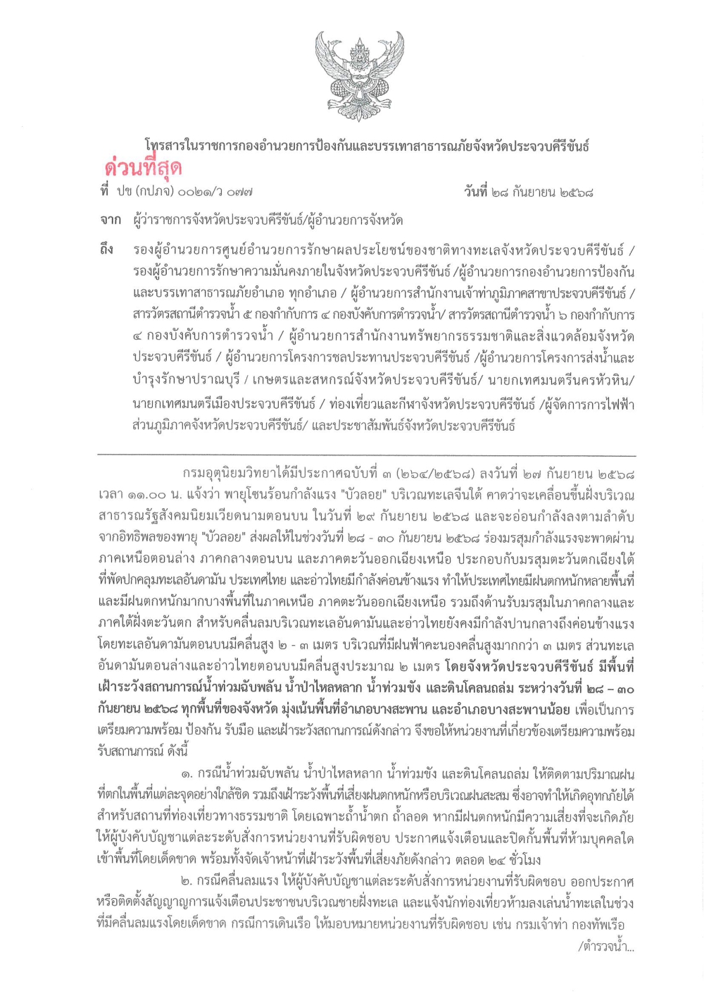 กองอำนวยการป้องกันและบรรเทาสาธารณภัยจังหวัดประจวบคีรีขันธ์ แจ้งเตือน “เฝ้าระวังสถานการณ์น้ำท่วมฉับพลัน น้ำป่าไหลหลาก น้ำท่วมขัง และดินโคลนถล่ม ระหว่างวันที่ 28 - 30 กันยายน 2568 “ตามหนังสือในราชการกองอำนวยการป้องกันและบรรเทาสาธารณภัยจังหวัดประจวบคีรีขันธ์ ด่วนที่สุด ที่ ปข (กปภจ) 0021/ ว 077 ลงวันที่ 28 กันยายน 2568