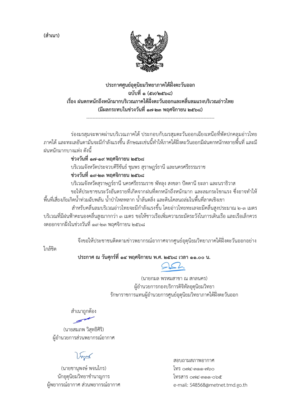 แจ้งเตือนฝนตกหนักถึงหนักมากระหว่าง 17 - 23 พฤศจิกายน 2568 ฝั่งอ่าวไทย ภาตคใต้
