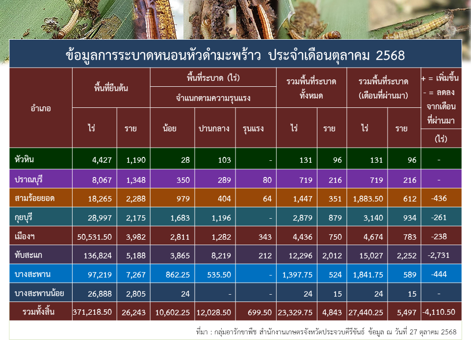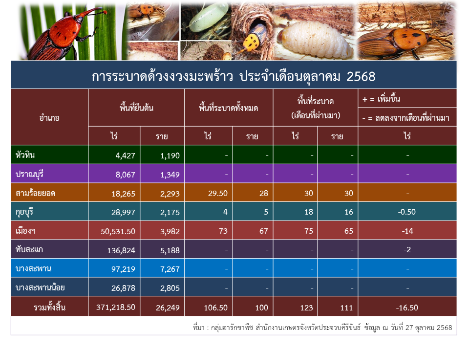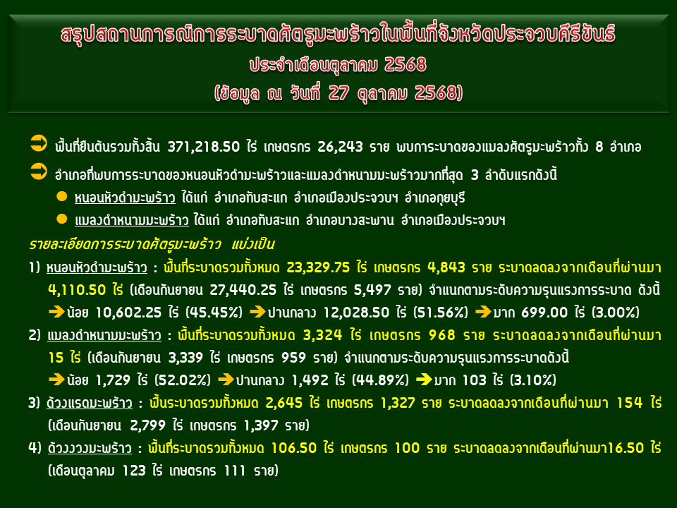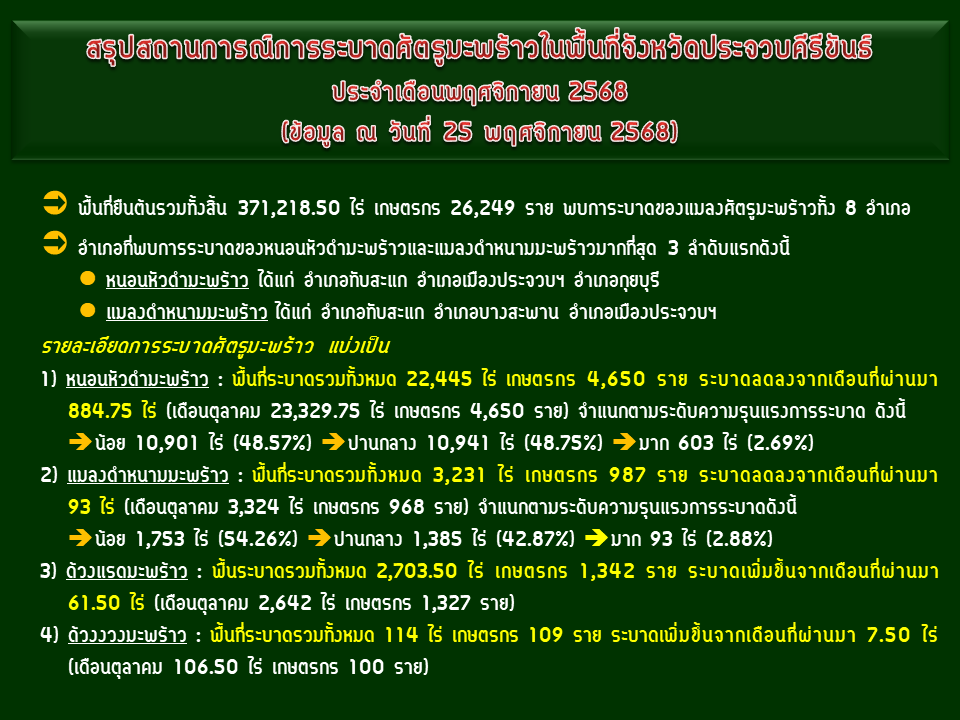 สรุปสถานการณ์การระบาดศัตรูมะพร้าวในพื้นที่จังหวัดประจวบคีรีขันธ์ ประจำเดือนตุลาคม และ พฤศจิกายน 2568