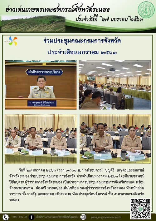 วันที่ 27 มกราคม 2563 เวลา 09.30 น. นางโรจนภรณ์ บุญศิริ เกษตรและสหกรณ์จังหวัดระนอง ร่วมประชุมคณะกรมการจังหวัด ประจำเดือนมกราคม 2563 โดยมีนายจตุพจน์ ปิยัมปุตระ ผู้ว่าราชการจังหวัดระนอง เป็นประธานการประชุมคณะกรมการจังหวัดระนอง พร้อมด้วยนายพรเทพ ผ่องศรี นายอนุสร ตันโชติกุล รองผู้ว่าราชการจังหวัดระนอง หัวหน้าส่วนราชการ ทั้งภาครัฐ และเอกชน เข้าร่วม ณ ห้องประชุมรัตนรังสรรค์ ชั้น 5 ศาลากลางจังหวัดระนอง
