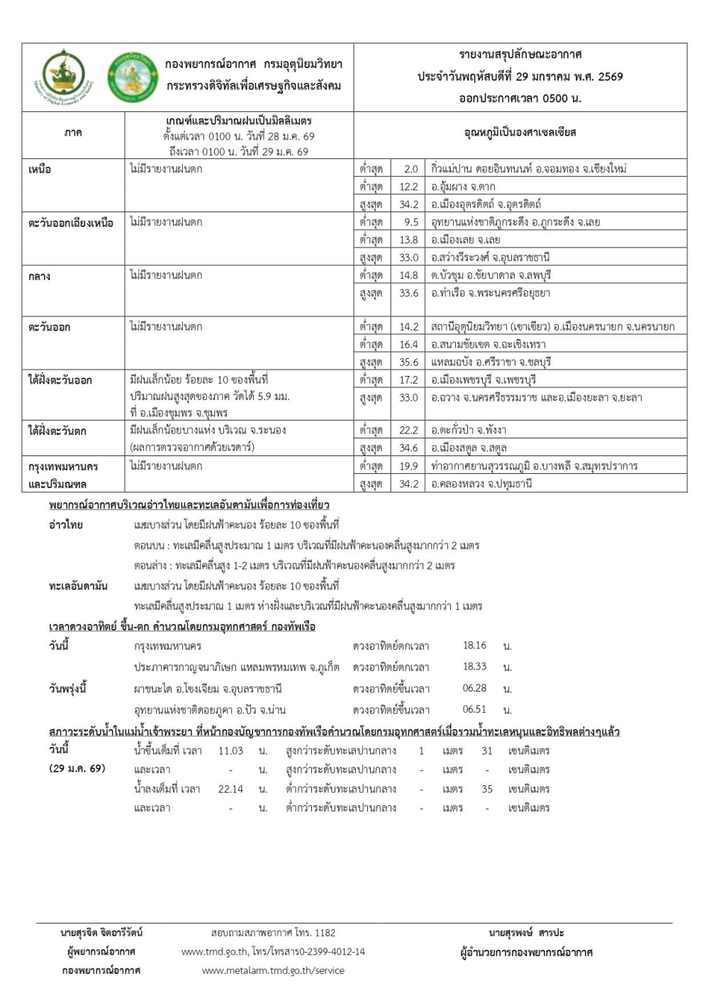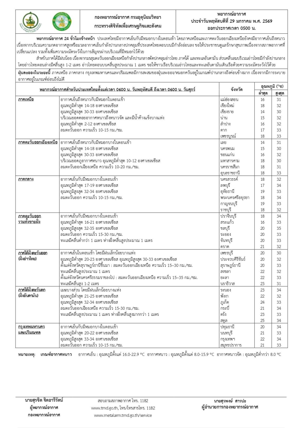 พยากรณ์อากาศรายภาคพร้อมแผนที่พื้นที่คาดการณ์ความเสี่ยงในการเกิดภัย ประจำวันที่ 29 มกราคม 2569 เวลา 06.00 น.