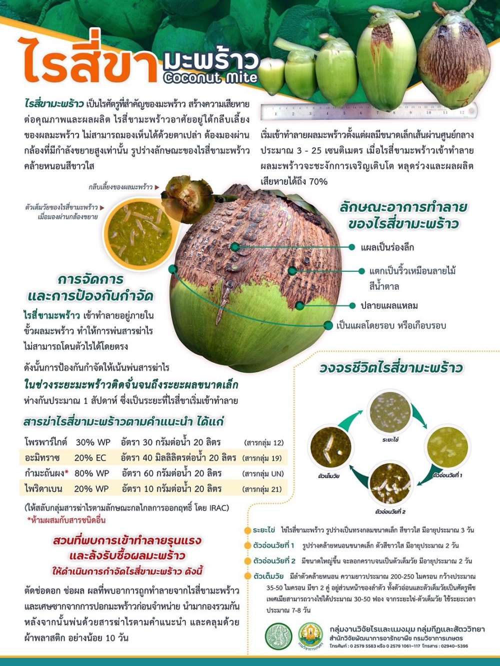 ในช่วงเข้าสู่ฤดูแล้งนี้ขอแจ้งเตือนให้ชาวสวนมะพร้าวเฝ้าระวังการแพร่ระบาดของไรสี่ขามะพร้าว ซึ่งเป็นศัตรูพืชสำคัญที่สร้างความเสียหายและระบาดในแหล่งปลูกมะพร้าวน้ำหอมที่สำคัญหลายประเทศ เช่น บราซิล อินเดีย เม็กซิโก ซึ่งปัจจุบันเริ่มระบาดและมีแนวโน้มที่จะรุนแรงมากขึ้นในหลายพื้นที่ของประเทศไทย โดยเฉพาะแหล่งปลูกมะพร้าวน้ำหอมที่สำคัญ เช่น สมุทรสงคราม สมุทรสาคร และฉะเชิงเทรา โดยไรสี่ขามะพร้าวจะอาศัยดูดกินอยู่ใต้กลีบเลี้ยงของผล ทำให้เกิดเป็นแผลร่องลึก ทำให้ขนาดผลเล็กลงอย่างชัดเจน หากระบาดรุนแรงจะทำให้มะพร้าวผลเล็ก ร่วง ส่วนผลที่ไม่ร่วงจะเล็กลีบไม่ได้ขนาด ไม่สามารถจำหน่ายได้ ดังนั้นเกษตรกรจำเป็นต้องสำรวจและกำจัดไรสี่ขาอย่างต่อเนื่อง จนกว่าจะไม่พบอาการของการระบาดในพื้นที่อีก