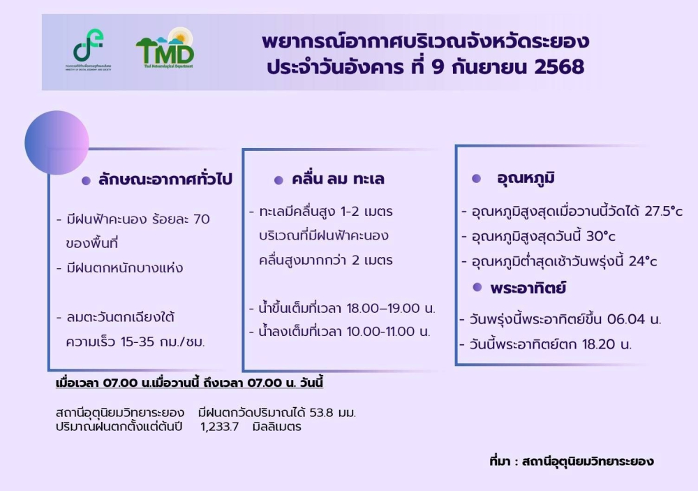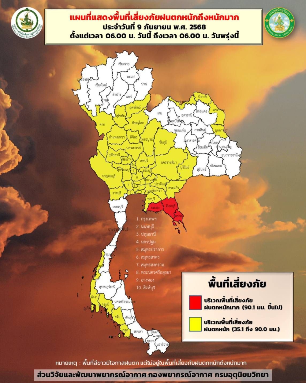 พื้นที่เสี่ยงภัยฝนตกหนักถึงหนักมาก ประจําวันที่ 9 กันยายน พ.ศ. 2568 ตั้งแต่เวลา 06.00 น. วันนี้ ถึงเวลา 06.00 น.