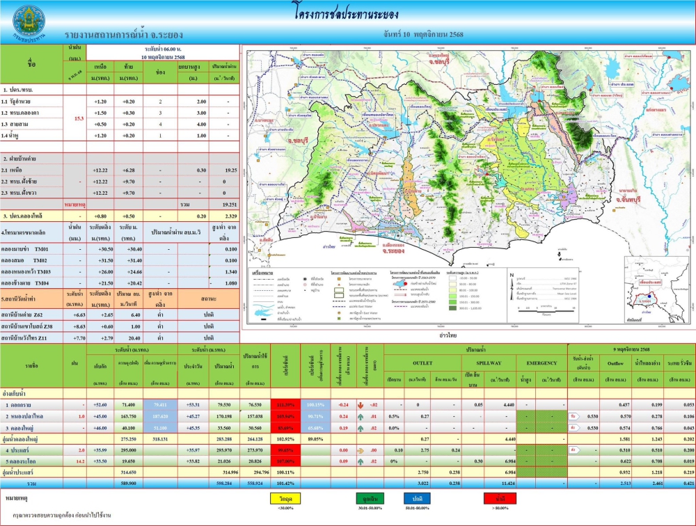 รายงานสถานการณ์ และการบริหารจัดการน้ำจังหวัดระยอง ข้อมูล ณ วันที่ 10 พฤศจิกายน 2568 (โครงการชลประทานระยอง)
