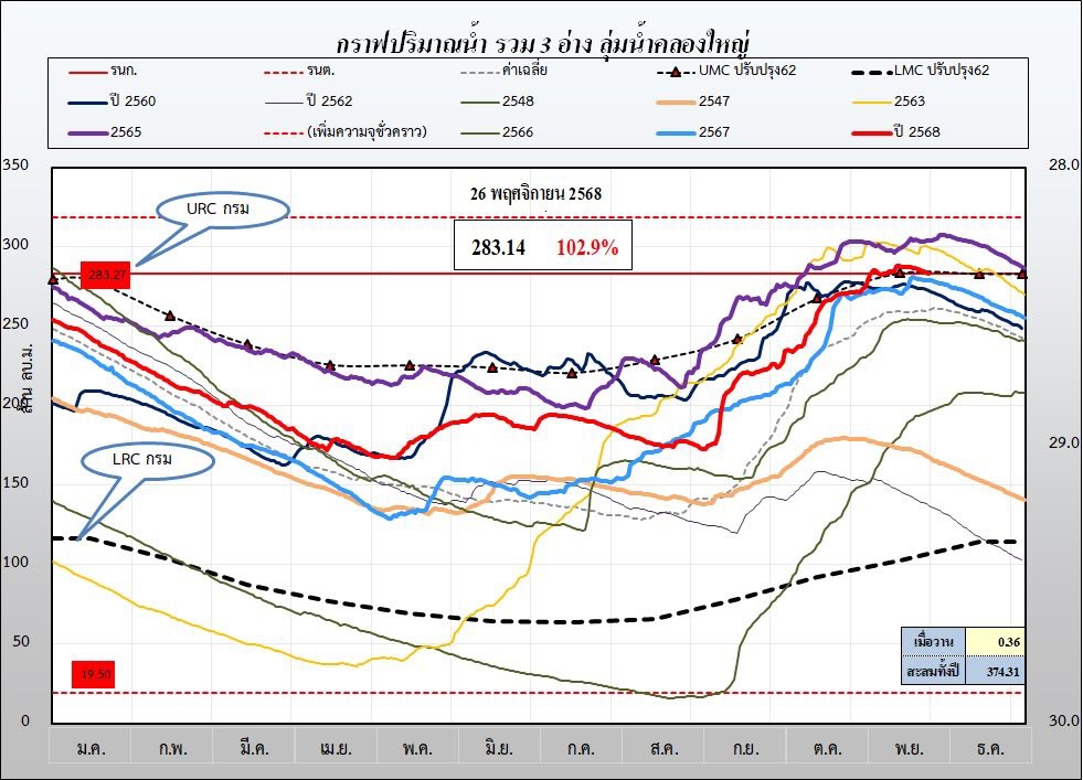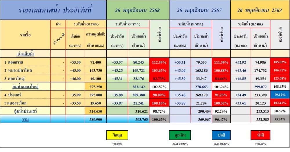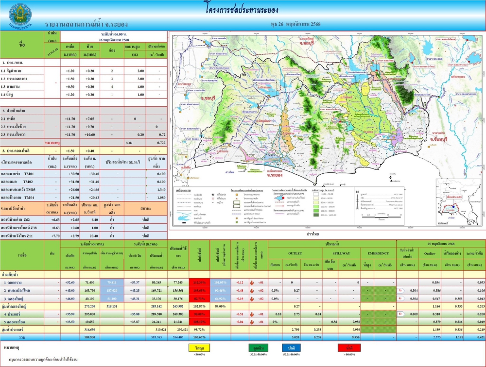 รายงานสถานการณ์ และการบริหารจัดการน้ำ จังหวัดระยอง /ข้อมูล ณ วันที่ 26 พฤศจิกายน 2568 (โครงการชลประทานระยอง )