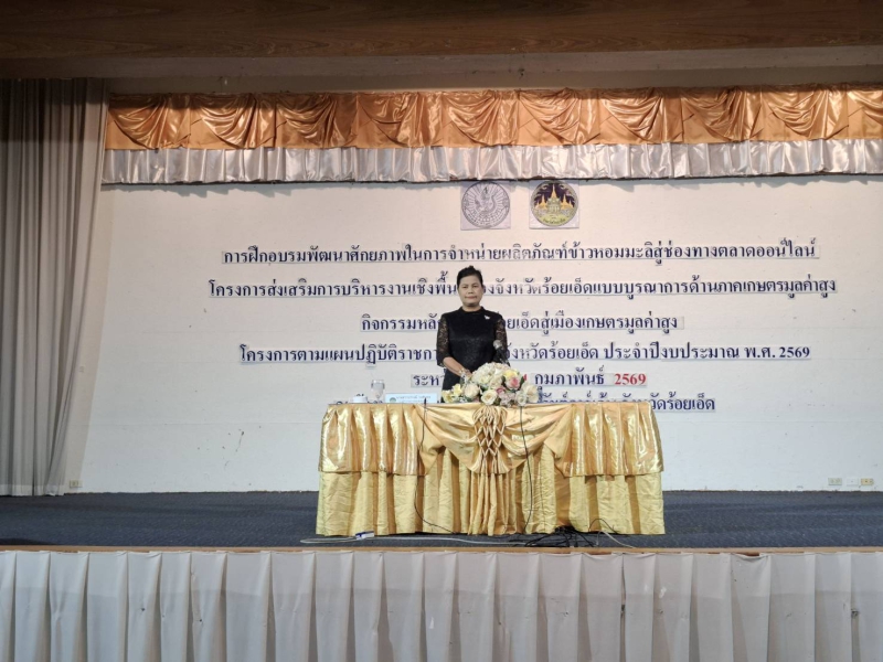 วันที่ 3 กุมภาพันธ์ 2569 เวลา 13.00 น. นายจิรัฐถิติกาล โพธิผล เกษตรและสหกรณ์จังหวัดร้อยเอ็ด ร่วมเป็นเกียรติในพิธีเปิดการฝึกอบรมพัฒนาศักยภาพในการจำหน่ายผลิตภัณฑ์ข้าวหอมมะลิสู่ช่องทางตลาดออนไลน์ ภายใต้โครงการตามแผนปฏิบัติราชการประจำปีจังหวัดร้อยเอ็ด พ.ศ. 2569 ณ ห้องประชุมประดับเพชร โรงแรมเพชรรัชต์การ์เด้น อำเภอเมือง จังหวัดร้อยเอ็ด โดยมี นางสาวปราณี วงศ์บุตร รองผู้ว่าราชการจังหวัดร้อยเอ็ด เป็นประธานในพิธี ซึ่งมีวัตถุประสงค์เพื่อให้เกษตรกรมีความสามารถในการแปรรูปข้าวหอมมะลิสู่เกษตรมูลค่าสูง และพัฒนาศักยภาพในการจำหน่ายผลิตภัณฑ์ข้าวหอมมะลิสู่ช่องทางตลาดออนไลน์ โดยมีเป้าหมาย จำนวน 420 ราย