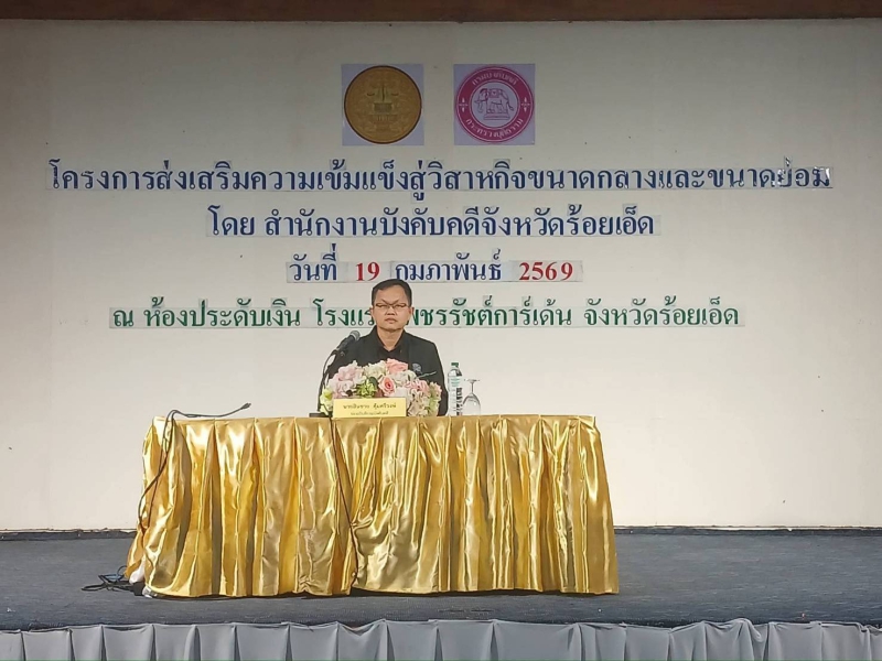 วันที่ 12 กุมภาพันธ์ 2569 เวลา 09.30 น. นายจิรัฐถิติกาล โพธิผล เกษตรและสหกรณ์จังหวัดร้อยเอ็ด มอบหมายให้ นายชัยวัฒน์ กงสะเด็น หัวหน้ากลุ่มช่วยเหลือเกษตรกรและโครงการพิเศษ ร่วมพิธีเปิดโครงการส่งเสริมความเข็มแข็งสู่วิสาหกิจขนาดกลางและขนาดย่อม ณ ห้องประดับเงิน โรงแรมเพชรรัชต์ การ์เด้น อำเภอเมือง จังหวัดร้อยเอ็ด โดยมี นายสินชาย คุ้มศรีวงษ์ รองอธิบดีกรมบังคับคดี เป็นประธานเปิดโครงการฯ