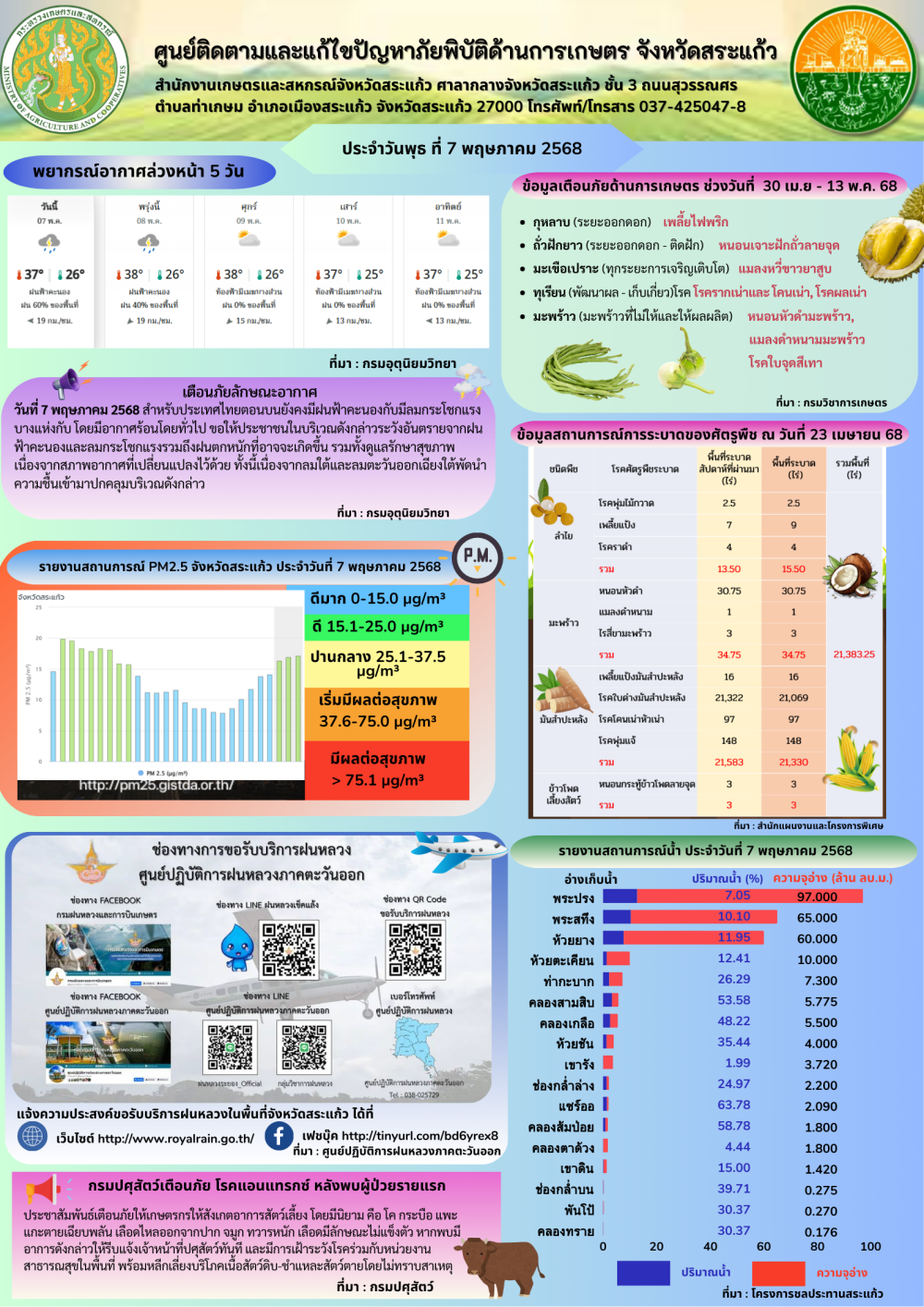 ศูนย์ติดตามและแก้ไขปัญหาภัยพิบัติด้านการเกษตร จังหวัดสระแก้ว ประจำวันที่ 7 พฤษภาคม 2568